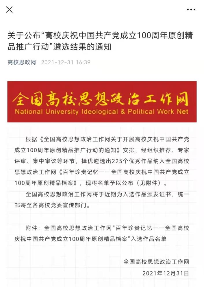 据悉,全国高校思想政治工作网于今年7月启动开展了“高校庆祝中国共产党成立100周年原创精品推广行动”。全国各高校踊跃报送优秀作品,经组织推荐、专家评审、和集中审议等环节,最终择优遴选出225个优秀作品纳入《百年珍贵记忆——全国高校庆祝中国共产党成立100周年原创精品档案》。