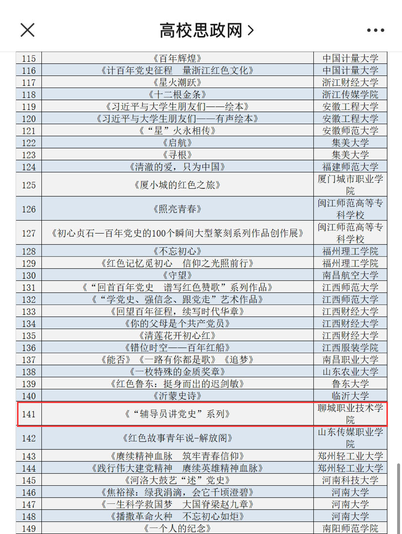 近日,全国高校思想政治工作网公布“高校庆祝中国共产党成立100周年原创精品推广行动”遴选结果,聊城职业技术学院“辅导员讲党史”系列视频成功入选。