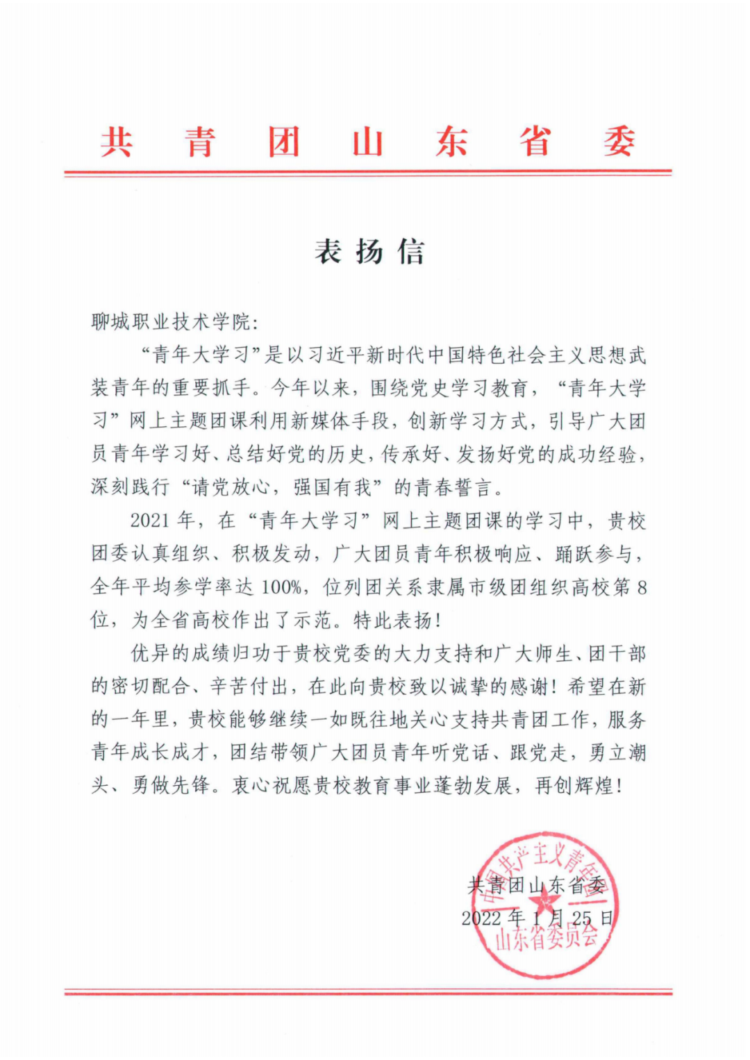 1月25日,我校收到共青团山东省委发来的表扬信,对我校在2021年度“青年大学习”网上主题团课学习中取得的优异成绩、展现的示范作用给予充分肯定。
