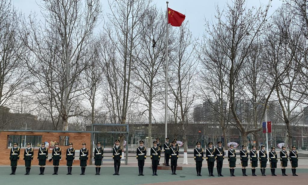 伴随着雄壮的《中华人民共和国国歌》,在国旗班的护卫下,五星红旗冉冉升起,全体师生高唱国歌,行注目礼。