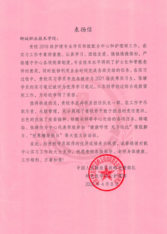 4月8日,我院收到中国人民解放军战略支援部队特色医学中心发来的表扬信,对我院护理系2019级实习生在院实习期间的优秀表现给予表扬。并向我校发来表扬信。六名实习同学,表现优异,经过综合选拔留院就业。