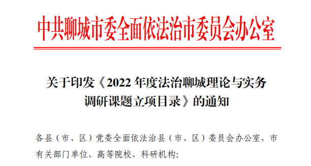 据悉,市委依法治市办组织开展2022年度法治理论与实务调研课题研究,旨在深入学习贯彻习近平法治思想,落实中央关于法治建设重大决策部署和省委、市委工作安排,围绕一体推进法治聊城、法治政府、法治社会建设,围绕法治护航“六个新聊城”建设,以影响全面依法治市工作开展的重大理论和实务问题为重点,聚焦法治建设领域亟待解决的现实矛盾问题,突出创新性、对策性和实用性,努力为法治聊城建设提供理论指引和学理支撑。