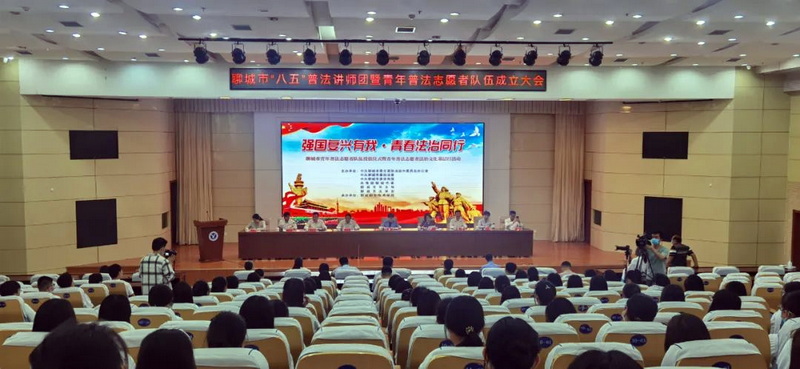 5月26日上午,聊城市“八五”普法讲师团暨青年普法志愿者队伍成立大会在聊城职业技术学院举行。校党委书记靳凤莲,党委副书记、院长徐龙海,市委依法治市办副主任、市委政法委分管日常工作的副书记郝润霞出席会议,市司法局党组书记、局长商光胜主持会议。共青团聊城市委书记徐保亮,市法学会党组书记、会长邓丽,聊城职业技术学院党委委员、副院长高杉,党委委员、副院长刘雪巍,市委宣传部四级调研员周政参加会议。