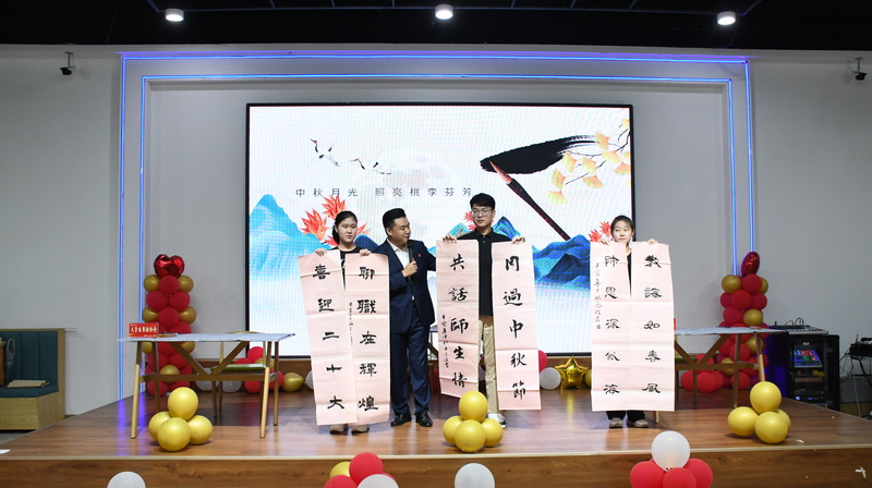 靳凤莲、徐龙海等校领导为过生日的师生切蛋糕、送蛋糕,并为师生送上月饼和礼包。抽盲盒、书法展示,活泼有趣的活动轮番上演,现场的氛围在全体人员唱响的生日祝福歌中达到高潮。