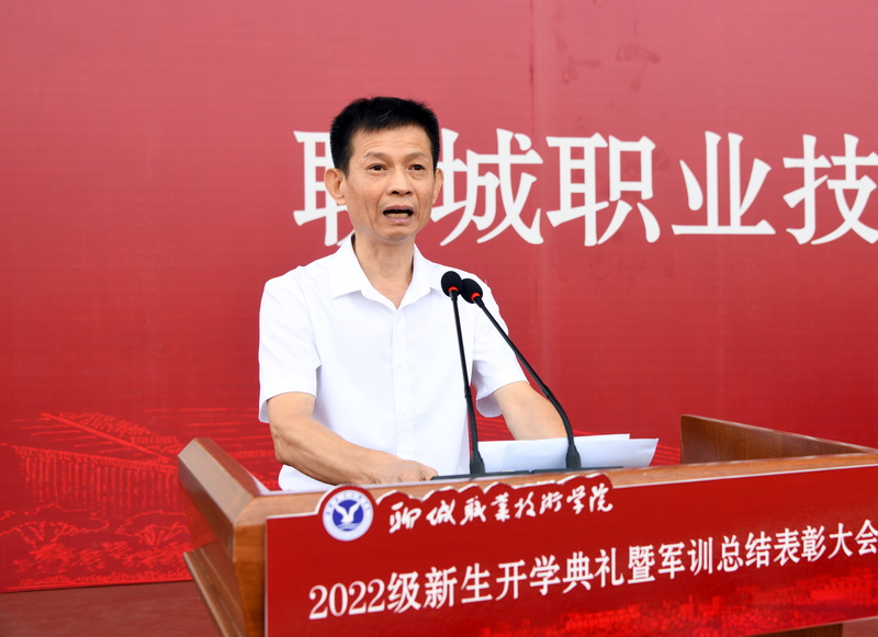 徐龙海代表学校向新生表示热烈的欢迎和衷心的祝贺,他向新生送上三点希望:一是要牢固树立“强国有我”的伟大志向,做信念坚定的聊职人。胸怀国之大者,自觉地把“小我”融入祖国的“大我”,努力成为美好生活的创造者、社会变革的参与者、民族复兴的贡献者,让青春在实现中华民族伟大复兴的中国梦中绽放异彩,交出一张“我将无我,不负中华”的人生答卷。二是要坚持锚定“技能报国”的奋斗目标,做创新有为的聊职人。珍惜宝贵的大学时光,秉持“厚德、博学、求精、创新”的校训,潜心学习新知识、钻研新技术、掌握新本领,争当工匠精神的传承者、劳模精神的践行者,早日成长为建设社会主义现代化强国的大国工匠。三是要积极锤炼“坚韧不拔”的意志品质,做担当奋进的聊职人。继续发扬军训中吃苦耐劳的精神,矢志奋斗,勇毅前行,以更加昂扬奋进的姿态,走好属于自己的长征路,在广阔的人生舞台上演绎自己的精彩篇章。