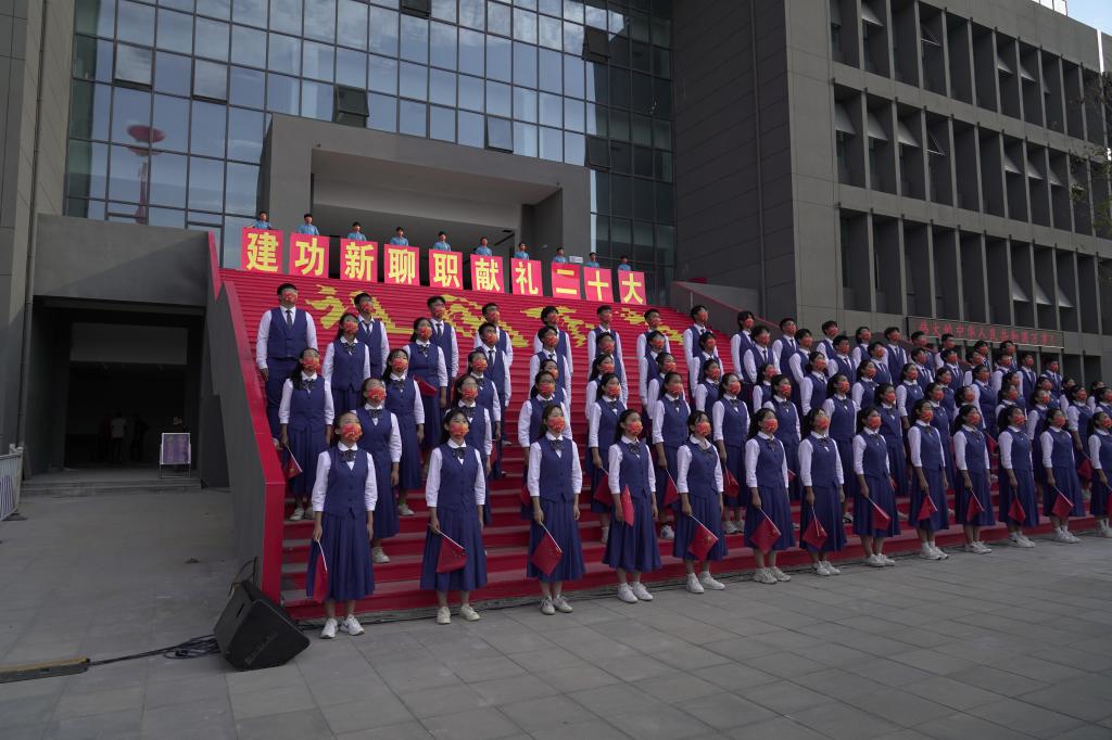 奋进新征程,逐梦新时代。全体师生们挥动手中的国旗,满怀激情,齐声高唱《歌唱祖国》,用嘹亮的歌声祝福伟大祖国繁荣昌盛、国泰民安。
