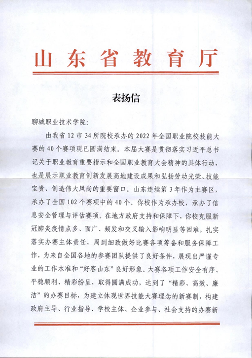 近日,山东省教育厅发来表扬信,对我校圆满承办2022年全国职业院校技能大赛(高职组)“信息安全管理与评估”赛项给予表扬。