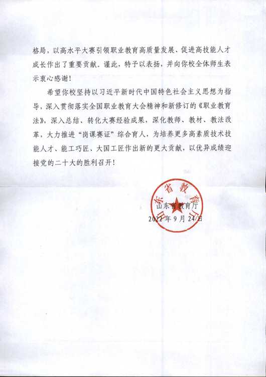 表扬信指出,我校作为承办校,克服新冠肺炎疫情点多、面广、频发和交叉输入影响明显等困难,扎实落实办赛主体责任,周到细致做好比赛各项筹备和服务保障工作,为来自全国各地的参赛团队提供了良好条件,展现出严谨专业的工作水准和“好客山东”良好形象。大赛各项工作安全有序、平稳顺利、精彩纷呈,取得圆满成功,达到了“精彩、高效、廉洁”的办赛目标,为建立体现世界技能大赛理念的新赛制,构建政府主导、行业指导、学校主体、企业参与、社会支持的办赛新格局,以高水平大赛引领职业教育高质量发展、促进高技能人才成长作出了重要贡献。