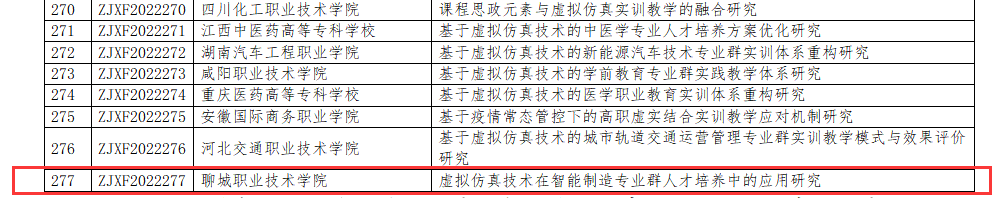 近日,教育部高等学校科学研究发展中心公布了2022年度《虚拟仿真技术在职业教育教学中的创新应用》专项课题拟立项名单,聊城职业技术学院机电工程系申报的《虚拟仿真技术在智能制造专业群人才培养中的应用研究》获得立项。