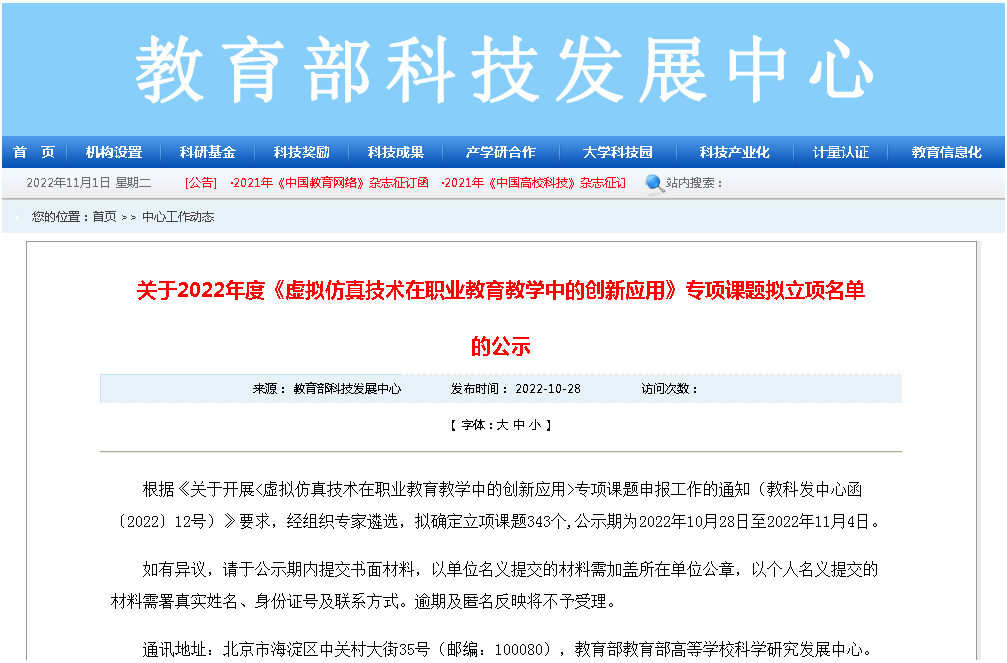 据悉,此次教育部高等学校科学研究发展中心拟立项一批《虚拟仿真技术在职业教育教学中的创新应用》专项课题,旨在助力职业教育数字化升级,探索虚拟仿真赋能职业教育教学的新思路、新模式、新机制,进一步推动国家职业教育虚拟仿真示范实训基地及职业教育示范性虚拟仿真实训基地建设。