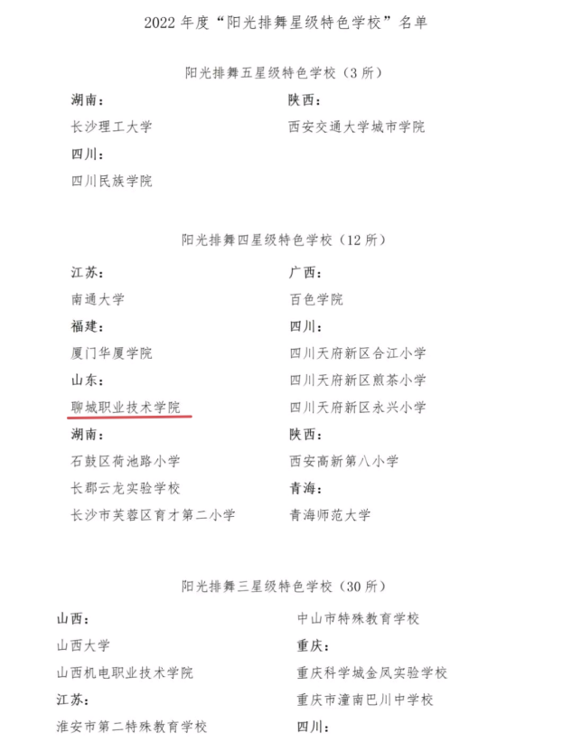 近年来,我校排舞项目构建了以师资培训、校园赛事、曲目创编、星级评选、论坛交流、网络课程“六位一体”的推广模式,学生参与人数逐年递增,连年获得多种奖项。近日,在学院大力支持下,通过师生的共同努力,经过申报、评选、公示,我院被国家体育总局体操运动管理中心、中国蹦床与技巧协会授予2022年“阳光排舞四星级特色学校”荣誉称号,是今年山东省唯一一所高职院校,同时也是山东唯一一所高校。本次评选面向全国大中小学,共评选出五星级特色学校3所、四星级特色学校12所、三星级特色学校30所等。