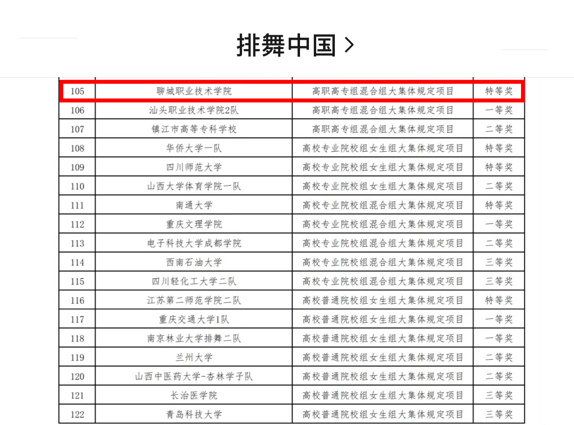 在基础部教师团队的带领下,我校排舞代表队在省赛获得特等奖后,丝毫不松懈,立即投入到总决赛的备赛中,持续立足专业特色,坚持以体载德、以体育美、以体筑智,不断优化队形、动作,加强特色编排,提升动作质量。面对来自全国的优秀队伍迎难而上,展现了聊职学子昂扬向上的风采。