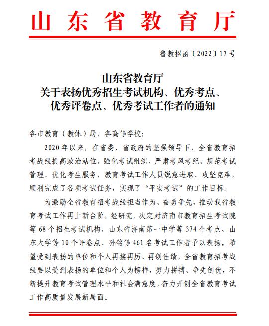 近日,山东省教育厅印发《关于表扬优秀招生考试机构、 优秀考点、优秀评卷点、优秀考试工作者的通知》(鲁教招函〔2022〕17号),聊城职业技术学院被评为“省级优秀考点”。据悉,此次表彰,全省共有包含山东大学在内的58所高校获评“优秀考点”荣誉称号,其中本科院校38所,高职(专科)院校20所。