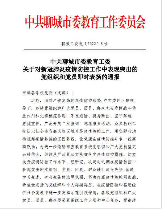 近年来,聊城职业技术学院始终坚持党对教育工作的全面领导,在科学技术创新、高技能人才培养、青年志愿服务、乡村振兴等领域,肩负起“聊职使命”,体现了“聊职担当”。学校将以此次通报表扬为契机,锚定争创一流、矢志走在前列,不断提升办学层次和办学质量,为服务聊城市经济与社会发展做出更大贡献。