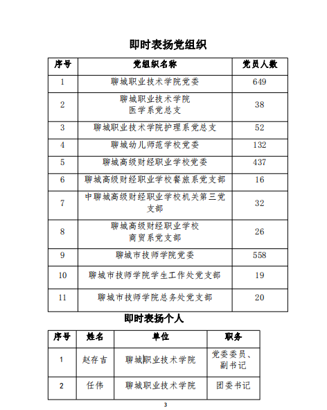 12月9日,中共聊城市委教育工委发布对新冠肺炎疫情防控工作中表现突出的党组织和党员即时表扬的通报。聊城职业技术学院党委、聊城职业技术学院医学系党总支、聊城职业技术学院护理系党总支获“即时表扬党组织”,聊城职业技术学院赵存吉、任伟、曹路涵、程吉瑞等1282名师生获“即时表扬个人”。此次即时表扬通报中,全市共有11个党组织、1303名个人获得表扬,我校成为获表扬党组织和总人数最多的单位。