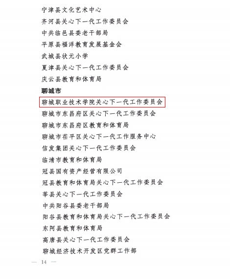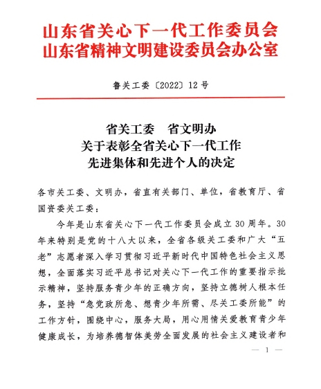 2022年是山东省关心下一代工作委员会成立30周年。为表彰先进,树立典型,激励各级关工委和广大“五老”不忘初心、牢记使命,坚定信念、担当作为,近日,省关工委、省文明办对在全省关心下一代工作中做出突出成绩的先进集体和先进个人进行表彰。聊城职业技术学院关心下一代工作委员会评为“全省关心下一代工作先进集体”,是聊城市唯一入选的高校关工委。