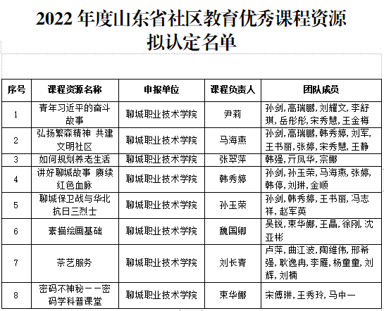 1月13日,山东省教育厅网站公布了2022年度山东省社区教育优秀课程资源遴选结果,聊城职业技术学院8门课程认定为山东省社区教育优秀课程资源,是山东省获评数量较多的单位之一。