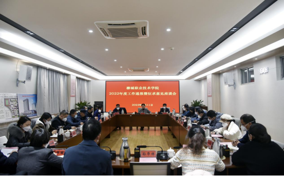 为高质量开好2022年度民主生活会,1月11日,聊城职业技术学院召开2022年度工作通报暨征求意见座谈会。学校领导班子成员,中层干部代表,党员代表、其他党派代表、教师代表、辅导员代表、离退休代表等参加会议。党委书记靳凤莲主持会议。