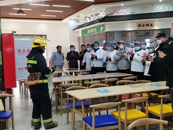 本次消防演练活动分为消防安全知识培训和消防实战演练两个环节。在消防安全知识培训环节,消防员讲解室内消火栓、室外灭火器的使用方法,以及火灾预防、应急自防、自救等消防基础知识和技能。在消防实战演练环节,安保和餐厅工作人员在消防员指导下进行灭火演练,实际操作灭火器材。