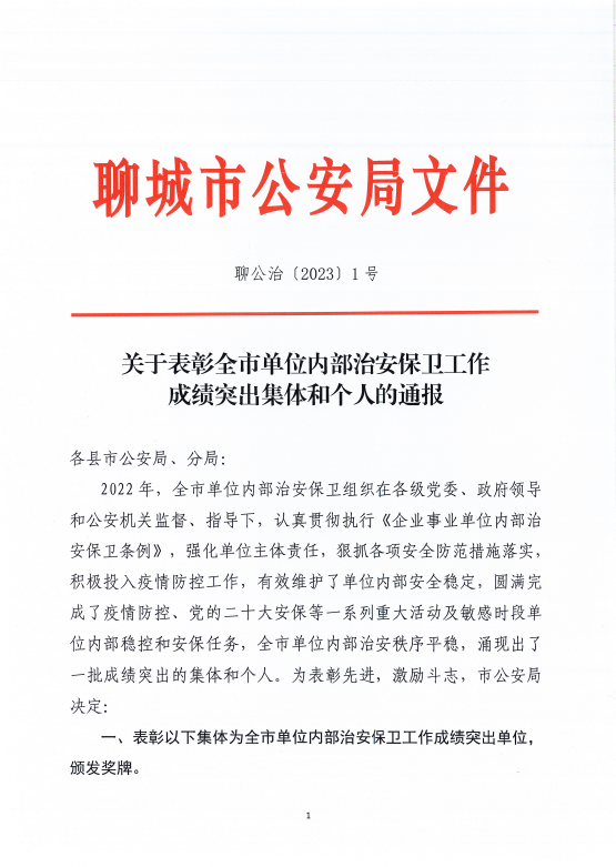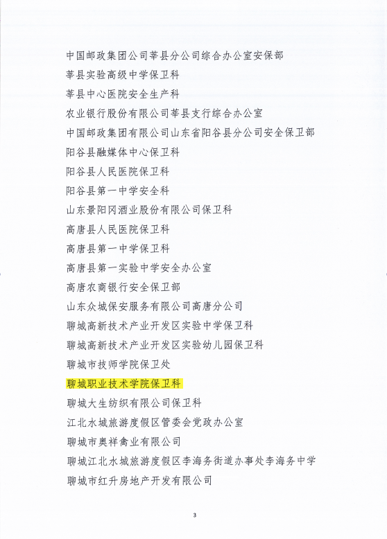 近日,聊城市公安局发布了《关于表彰全市单位内部治安保卫工作成绩突出集体和个人的通报》,聊城职业技术学院保卫科被评为“2022年聊城市单位内部治安保卫工作先进集体”,杨继岭和张培强被评为“2022年聊城市单位内部治安保卫工作先进个人”。
