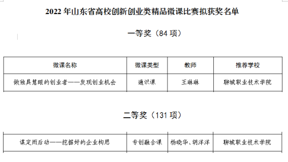 近日,山东省教育厅公布了2022年山东省高校创新创业类精品微课比赛获奖名单,我校荣获一等奖1项,二等奖1项,是我校创新创业类课程资源建设取得的又一佳绩。