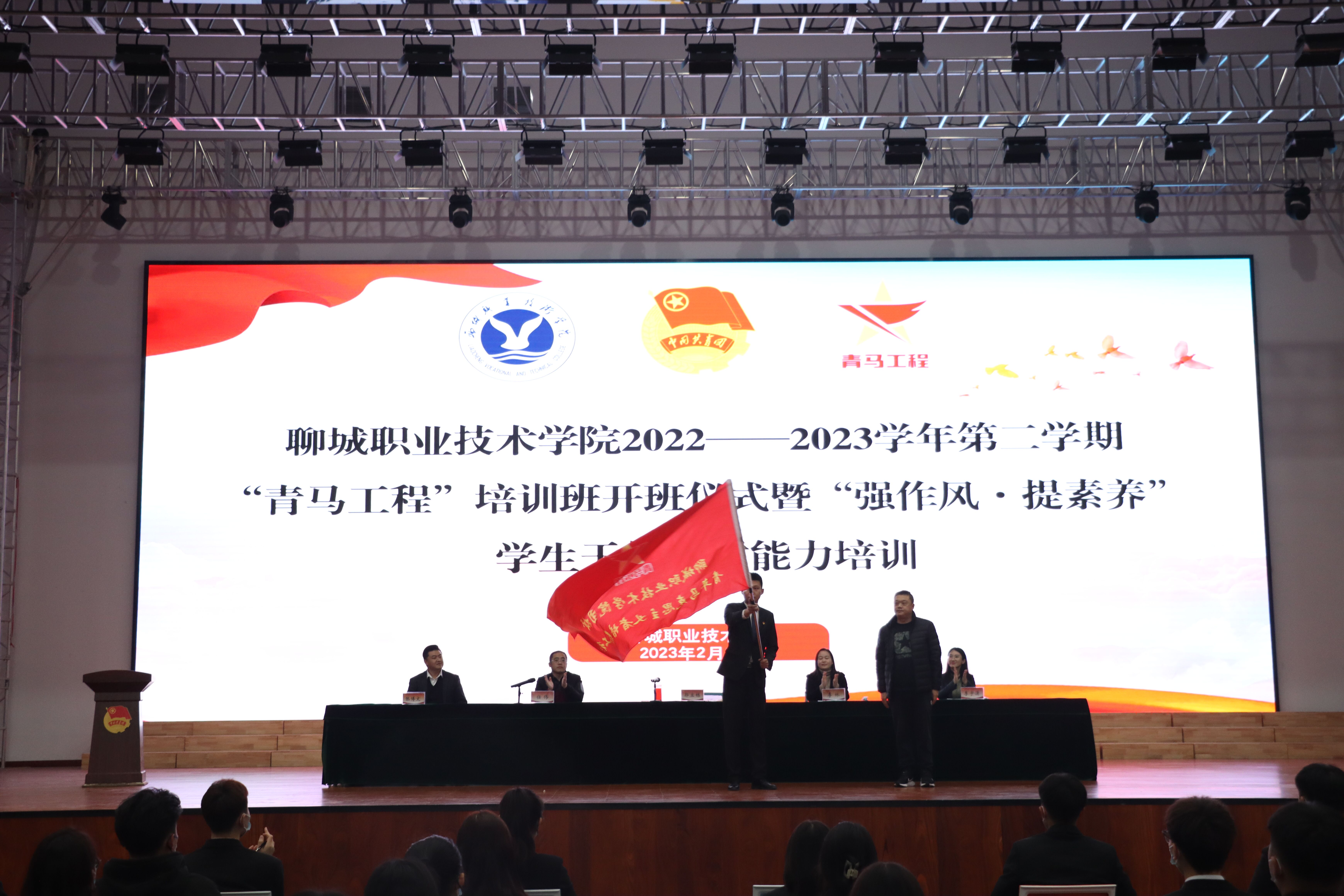 大会在雄壮的国歌声中拉开序幕,大会对2022-2023学年第一学期“青马工程”培训班优秀青马学员进行表彰。与会领导及老师为优秀青马学员代表颁奖,为“青马工程”培训班授旗。