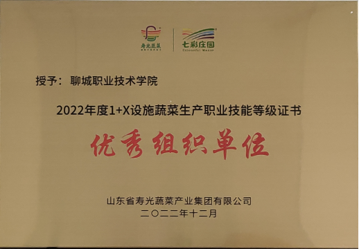 近日,教育部2020年授权的1+X证书制度试点第四批职业教育培训评价组织——山东省寿光蔬菜产业集团有限公司授予我校2022年度1+X设施蔬菜生产职业技能等级证书优秀组织单位。