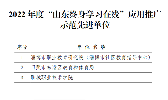 本次推广活动由山东省社区教育指导服务中心主办,共评选出2022年度“山东终身学习在线”应用推广示范先进单位3家,“山东终身学习在线”应用推广先进单位13家,“山东终身学习在线”应用推广先进个人44名。