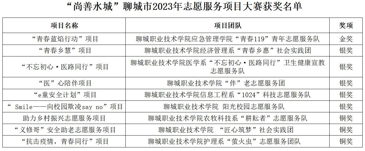 近日,由中共聊城市委宣传部、共青团聊城市委、聊城市民政局主办,聊城高新区党群工作部、聊城青年志愿者协会承办,聊城职业技术学院团委协办的“尚善水城”2023年聊城市志愿服务项目大赛圆满举行。全校共有9个优秀志愿服务项目入围终评,经过激烈角逐,获得金奖1项,银奖5项,铜奖3项的优异成绩。