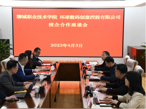 4月3日,环球数码创意控股有限公司董事总经理王宏鹏,产业运营总监王彩玲等一行来校进行合作洽谈,党委副书记、院长徐龙海热情接待王宏鹏一行。党委副书记赵存吉,党委委员、副院长徐洪祥,党委委员、宣传部部长高平,党委委员、组织部部长葛序风参加活动。