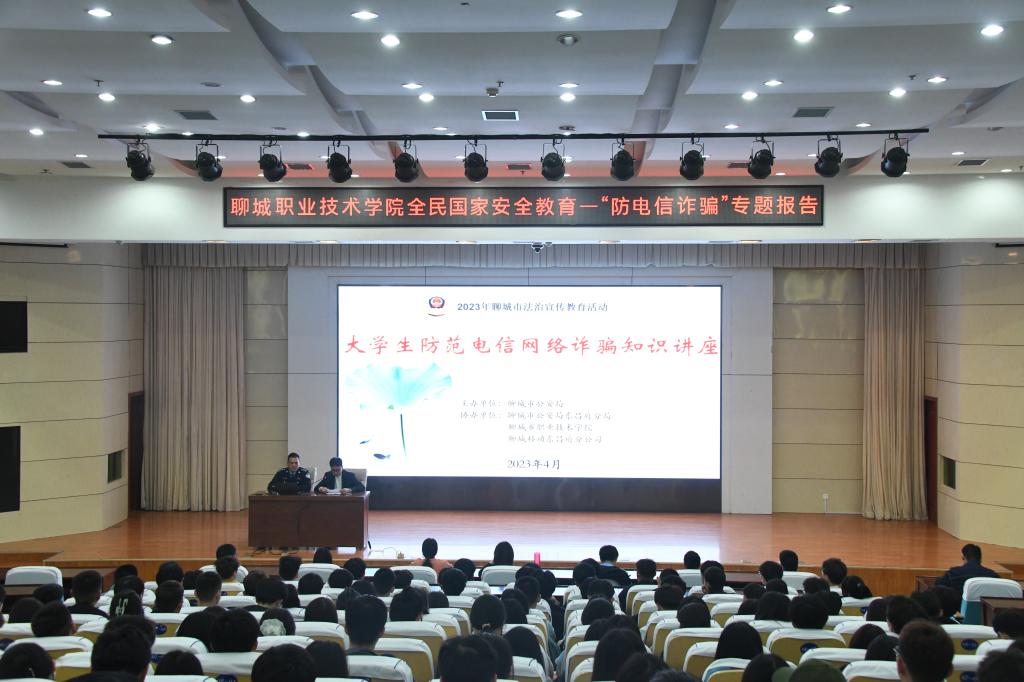 在第8个全民国家安全教育日到来之际,为进一步增强学生防骗意识,提高识别应对电信诈骗能力,4月12日,我校组织开展防电信诈骗专题讲座。讲座邀请聊城市公安局东昌府分局反诈中心三级警长陈以潮作报告,辅导员和学生代表300余人现场聆听报告。