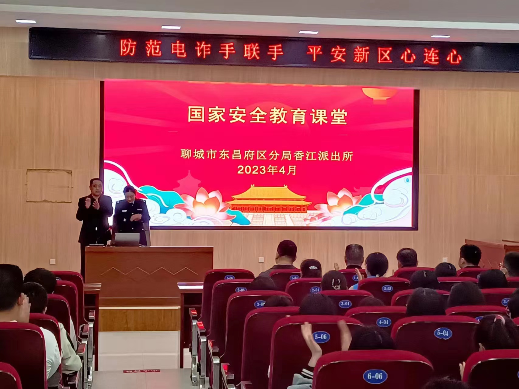 为深入学习贯彻党的二十大精神和习近平总书记关于国家安全工作的重要论述,推进国家安全法律的宣传教育,切实增强全校师生维护国家安全的自觉性、责任感和使命感,4月20日,保卫科联合经济管理系共同举办“国家安全教育课堂”专题讲座,邀请香江派出所荣玮娜警官、新区街道网格员宣讲团李龙飞老师进行知识宣讲。东昌府区公安分局党委委员、副局长、四级高级警长白云峰,香江派出所副所长毛文玉,新区办事处综治办相关领导出席会议,近200名师生聆听了报告。会议由保卫科科长杨继岭主持。