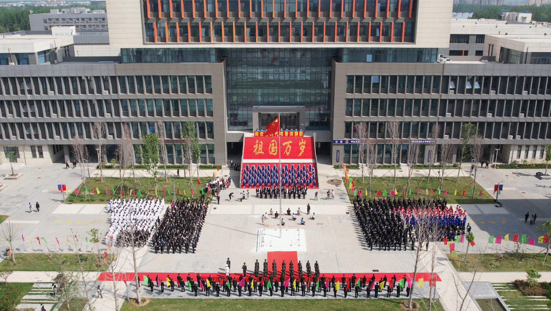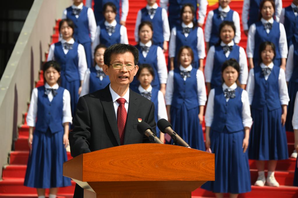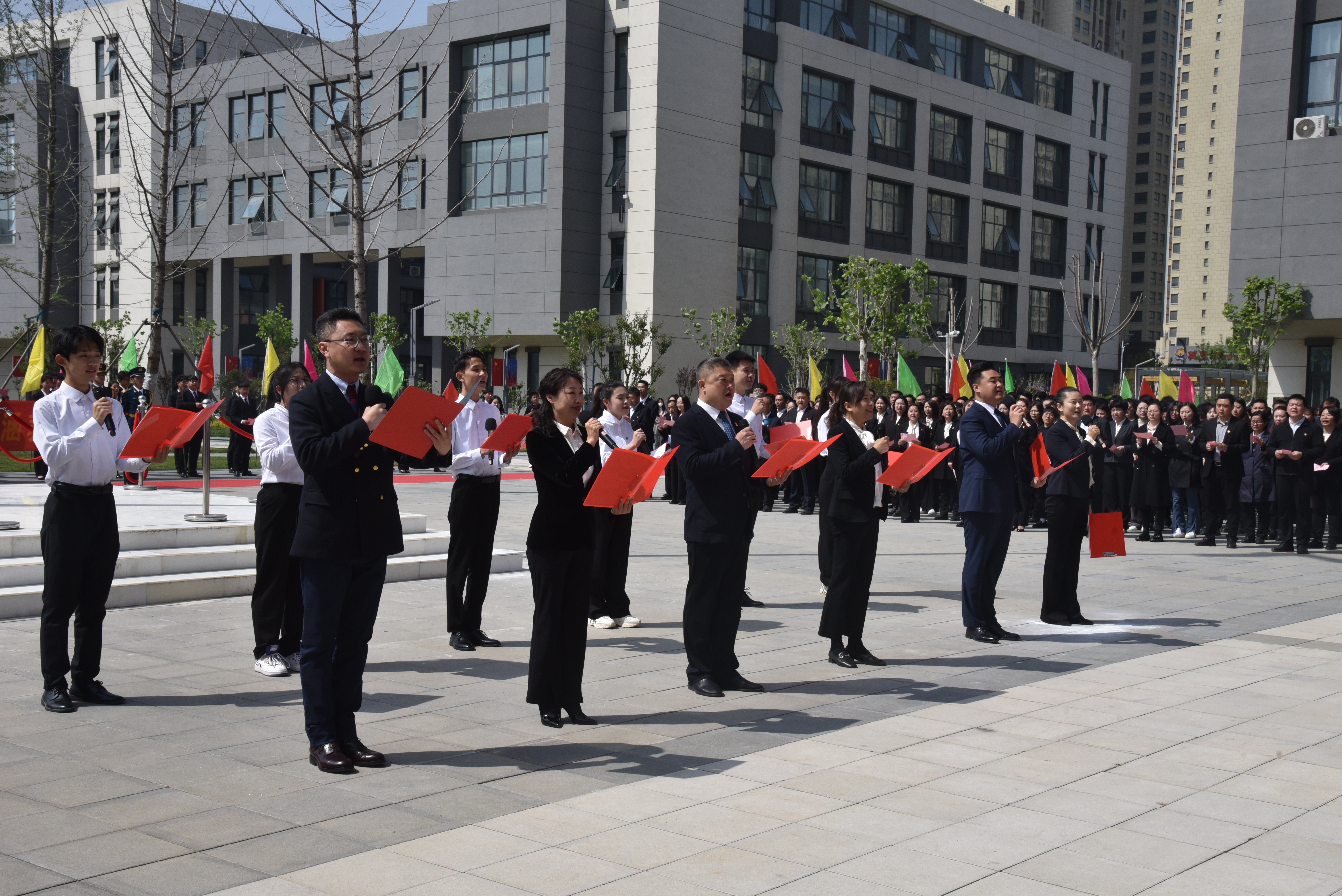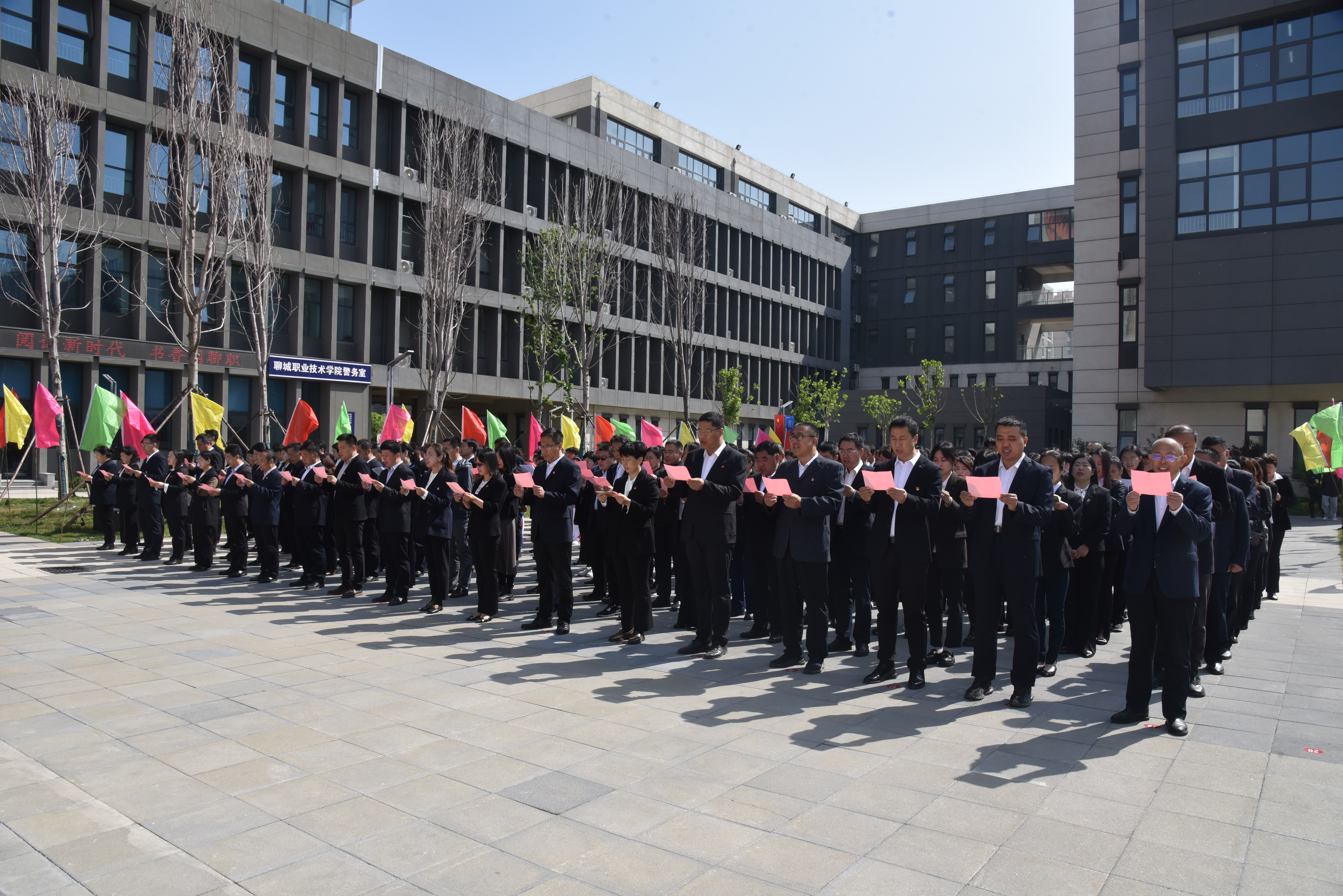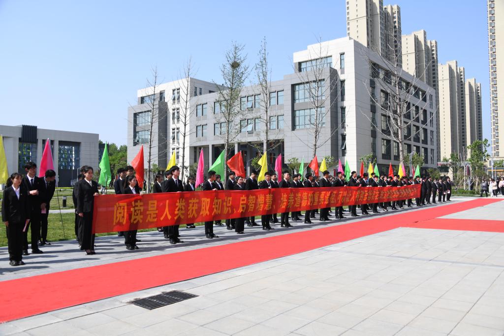 在隆重的升旗仪式后,徐龙海致辞。他指出,中华民族自古以来就是一个热爱读书的民族,凿壁借光、囊萤映雪的典故传为佳话。进入新时代,国家大力倡树学习型社会,全民阅读、终身学习成为社会新时尚。学校积极打造“书香聊职”,广大师生继承和发扬读书的优良传统,大兴勤奋学习之风,营造了尊重知识、崇尚科学、热爱阅读的良好氛围。为满足多元化的学习需求,学校精心打造了富有时代气息、文化底蕴的现代化新图书馆,为全体师生提供一个崭新的资源宝库、学术殿堂和精神家园。他希望同学们用好学校的资源和平台,培养良好的阅读习惯,爱读书、读好书、善读书,让每一天都成为“读书日”,在读书中感悟真理之美、筑牢信仰之基,让浓郁的书香充满校园,为实现中华民族伟大复兴作出更大贡献。