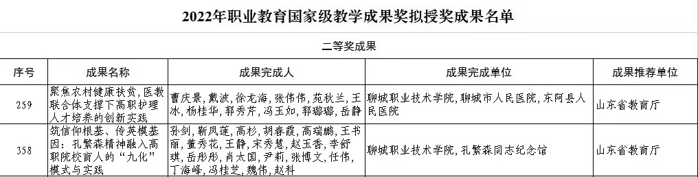 公示的572项职业教育国家级教学成果奖拟授奖项目中,包含特等奖2项、一等奖70项、二等奖500项。聊城职院曹庆景等完成的《聚焦农村健康扶贫,医教联合体支撑下高职护理人才培养的创新实践》和孙剑等完成的《筑信仰根基、传英模基因:孔繁森精神融入高职院校育人的“九化”模式与实践》获二等奖。
