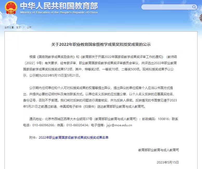近日,教育部发布《关于2022年职业教育国家级教学成果奖拟授奖成果的公示》,聊城职业技术学院被推荐的两项成果获职业教育国家级教学成果奖二等奖,实现了学校在教育教学改革中历史性的重大突破。
