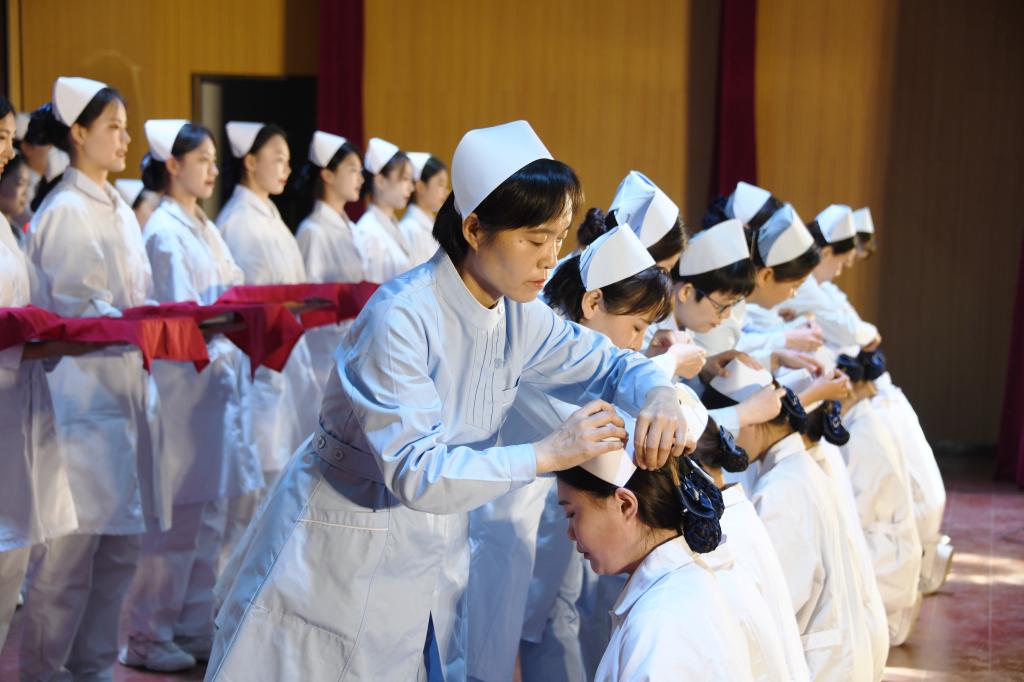 授帽仪式将此次活动推向高潮,一顶顶纯洁的燕尾帽、一盏盏明亮的红烛,指引着即将走向护士行业的学生坚定信念,用细心、耐心、爱心服务每一位患者。
