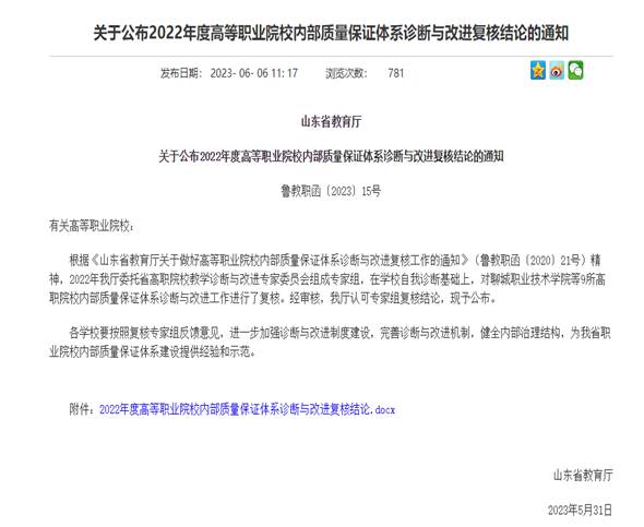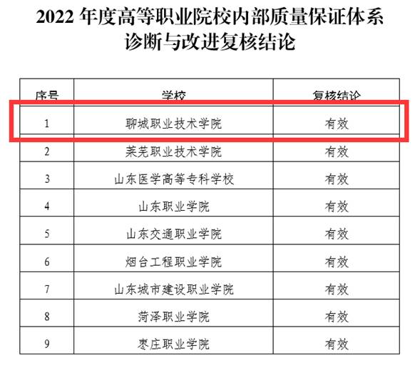 近日,山东省教育厅发布《关于公布2022年度高等职业院校内部质量保证体系诊断与改进复核结论的通知》,我校顺利通过复核。