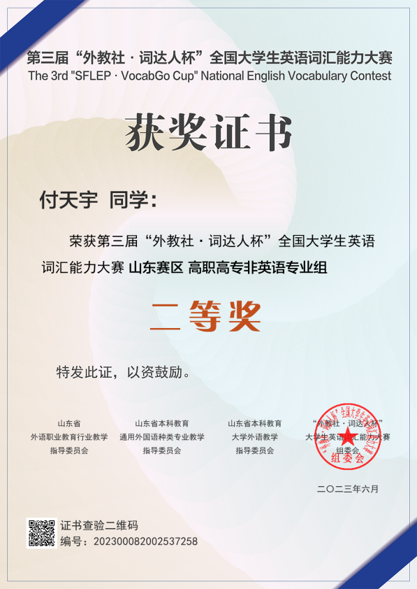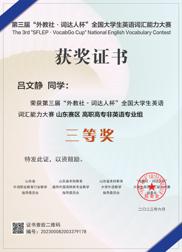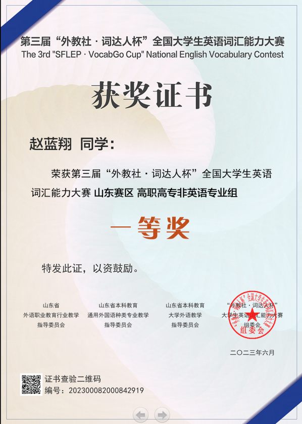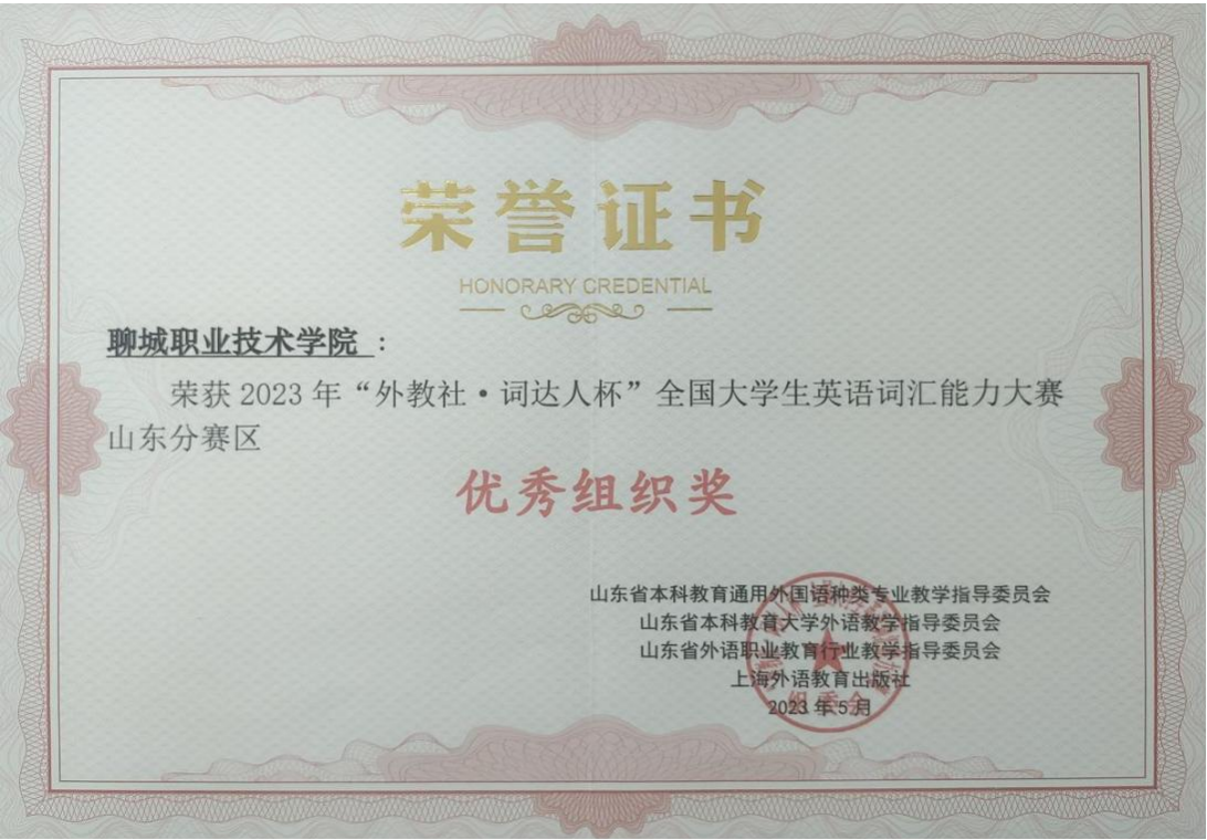 6月15日,2023年第三届“外教社·词达人杯”全国大学生英语词汇能力大赛获奖名单揭晓。聊城职业技术学院共有232位同学成功晋级进入省赛,10位同学获得一二三等奖等省级奖励,学校获2023年“外教社·词达人杯”全国大学生英语词汇能力比赛“优秀组织奖”。