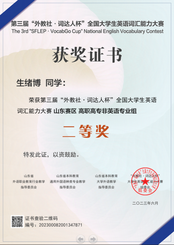 赵蓝翔同学获得山东省省赛一等奖并成功晋级国赛,将在群“英”荟萃中,一决“词”雄;生绪博、付天宇同学获得山东省省赛二等奖;吕文静、胡伟康、吴雨晨、邢文博、商行璐、仇传爽、王瑞盈七位同学获山东省省赛三等奖。王兰天、郝艳青等10位教师获得“优秀指导教师”。