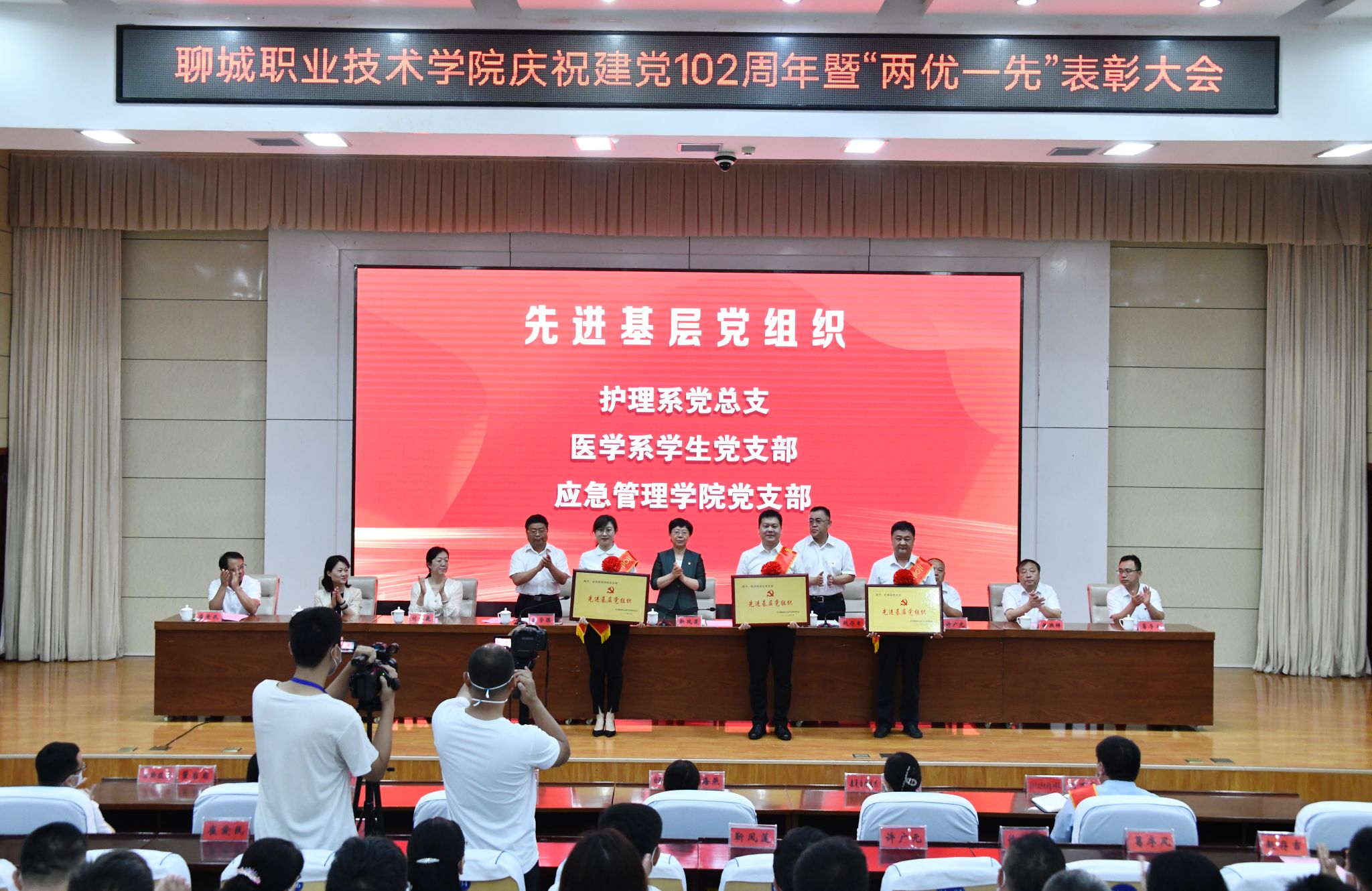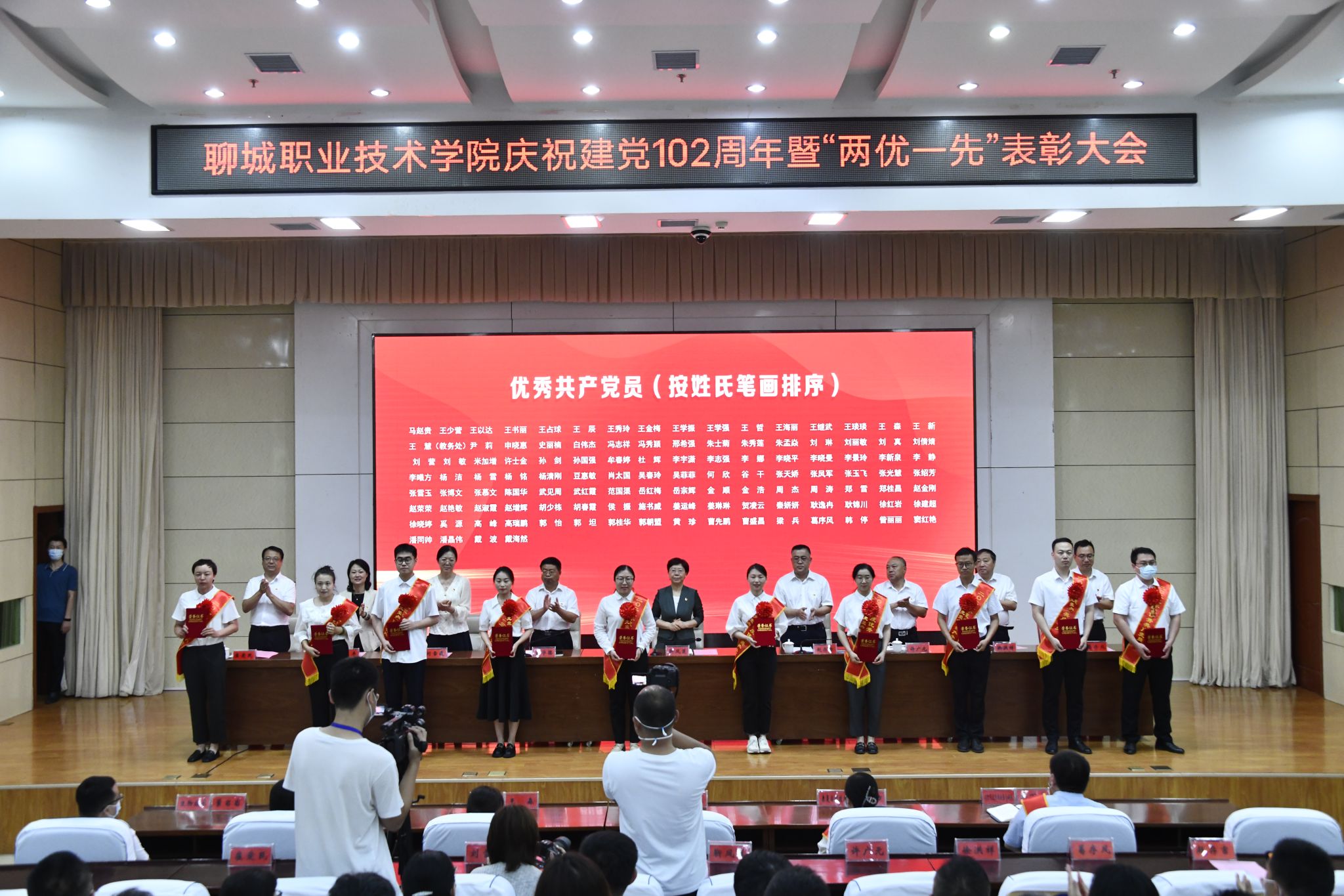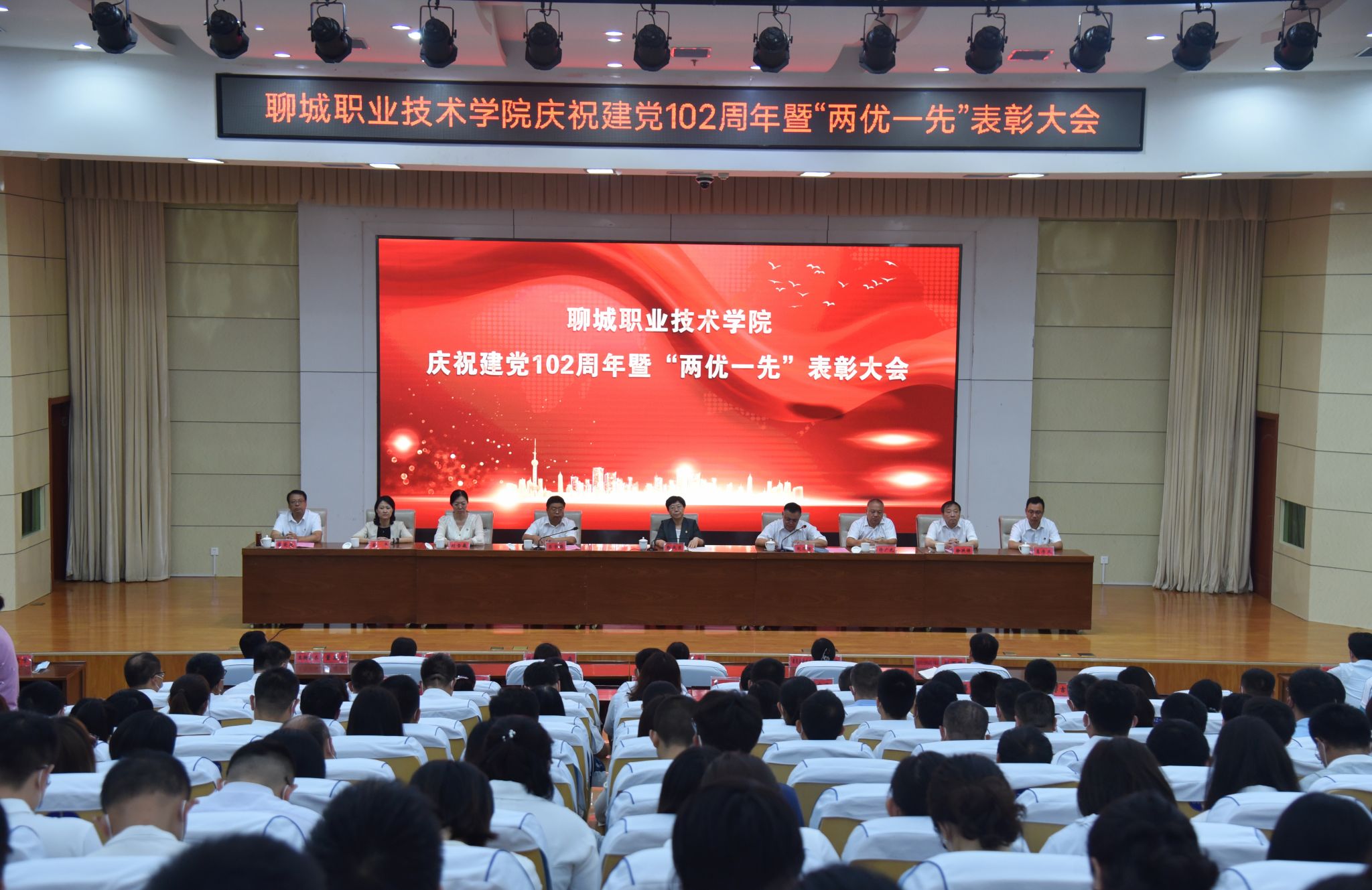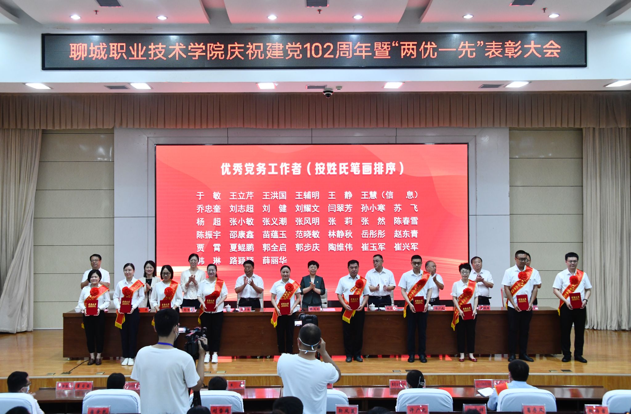 6月30日,在“七一”建党节来临之际,聊城职业技术学院召开庆祝建党102周年暨党建“两优一先”表彰大会。党委书记靳凤莲主持会议并讲话,学校领导赵存吉、吕学德、许广元、刘雪巍、徐洪祥、高平、葛序风、崔爱民出席。全体科级干部及教师代表共350余人参加会议。