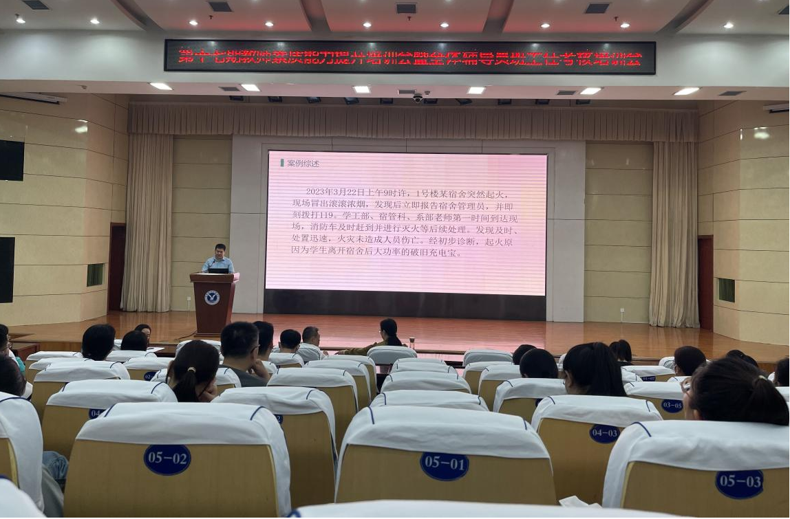 第二阶段,各系结合本学期发生的学生安全和管理方面的案例,进行案例分析和反思。建筑工程系党总支副书记邵琰根据两例学生危机应对事件进行《基于“1630”工作机制的危机处理案例分析》;机电工程系党总支副书记张凤军作题为《珍爱生命,绽放你灿烂笑脸》的案例分析,讲解如何预防和应对极端突发事件;医学系团总支副书记王新以宿舍消防为案例,讲解如何《奏好消防安全“四部曲”,唱响安全主旋律》。