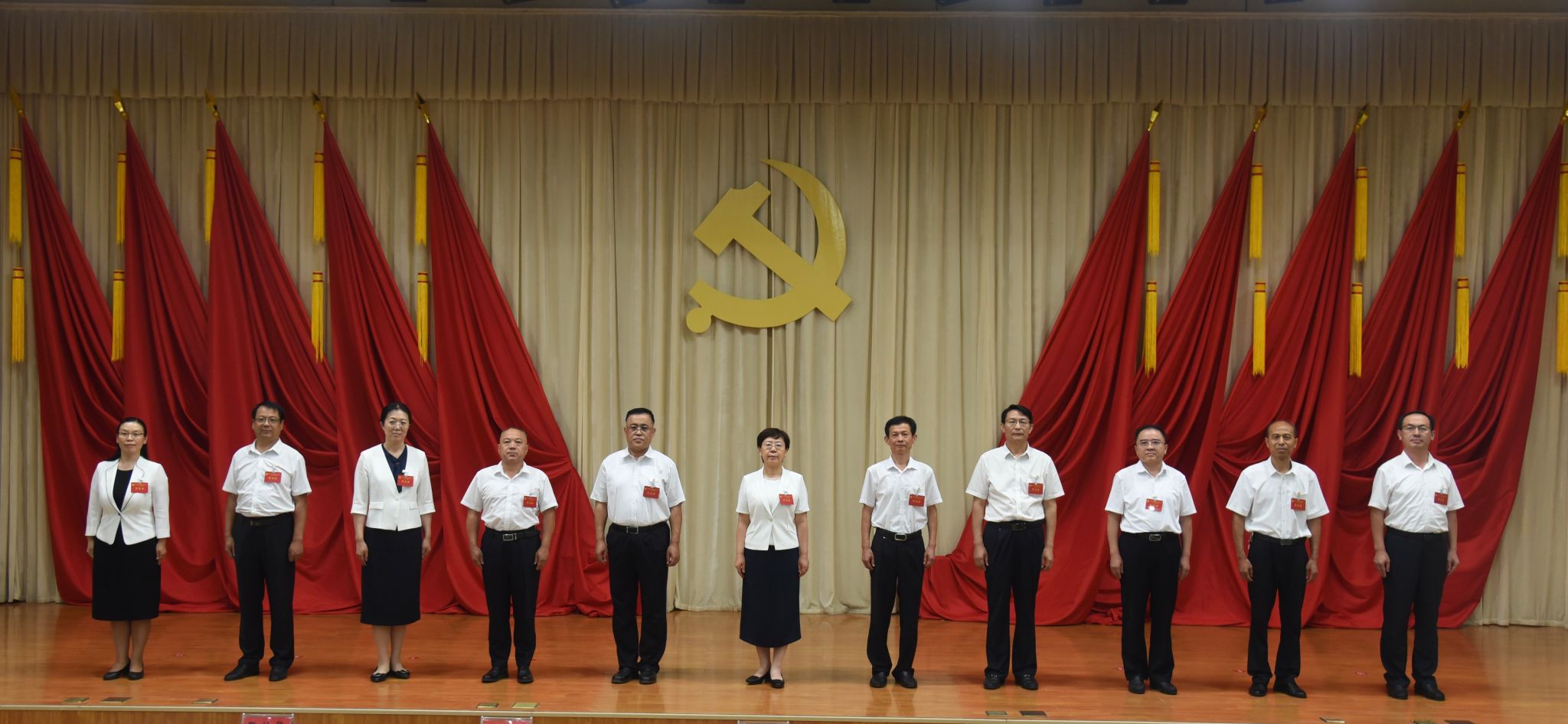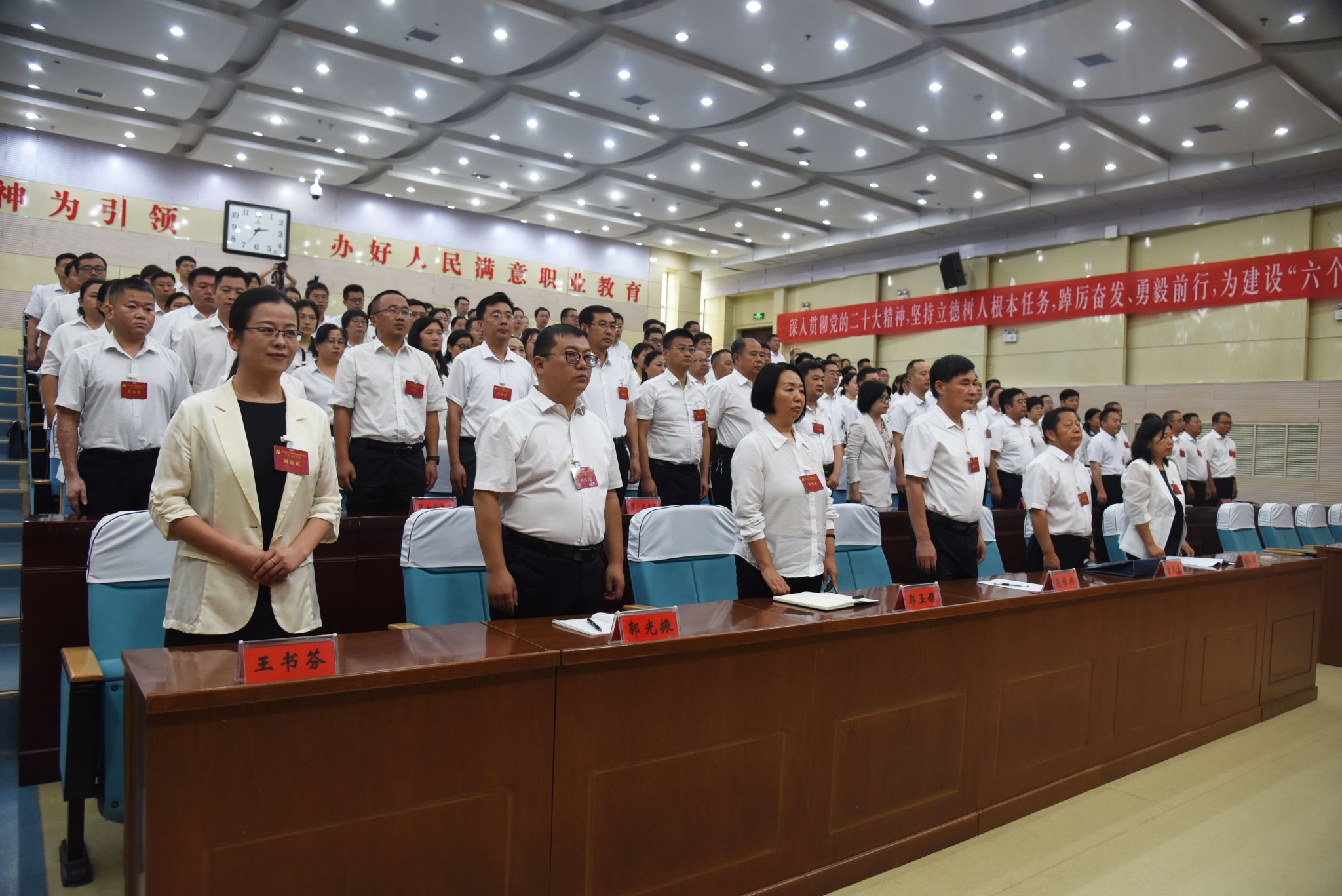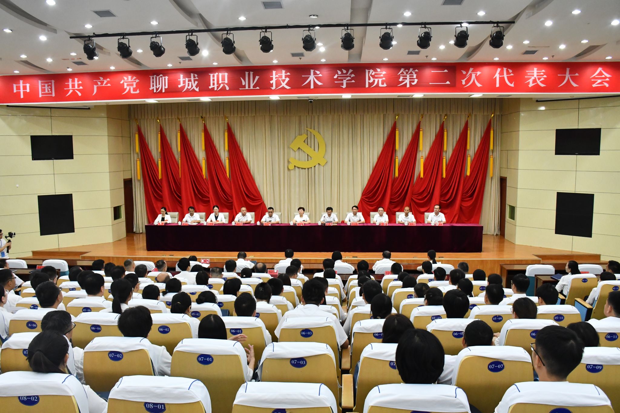 大会现场气氛庄重热烈,主席台正上方悬挂着“中国共产党聊城职业技术学院第二次代表大会”会标,帷幕正中悬挂的党徽熠熠生辉,十面鲜艳的红旗分列两侧。