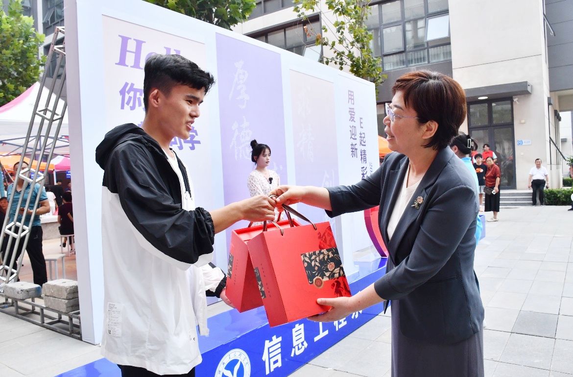 在迎新现场,靳凤莲与学生及家长面对面交流,对各位新同学加入聊城职业技术学院这个大家庭表示欢迎,并详细了解新生报到入学的情况和需要解决的困难,还与新生共同体验报到打卡等活动,并向恰逢9月2日生日的同学送上生日礼物。
