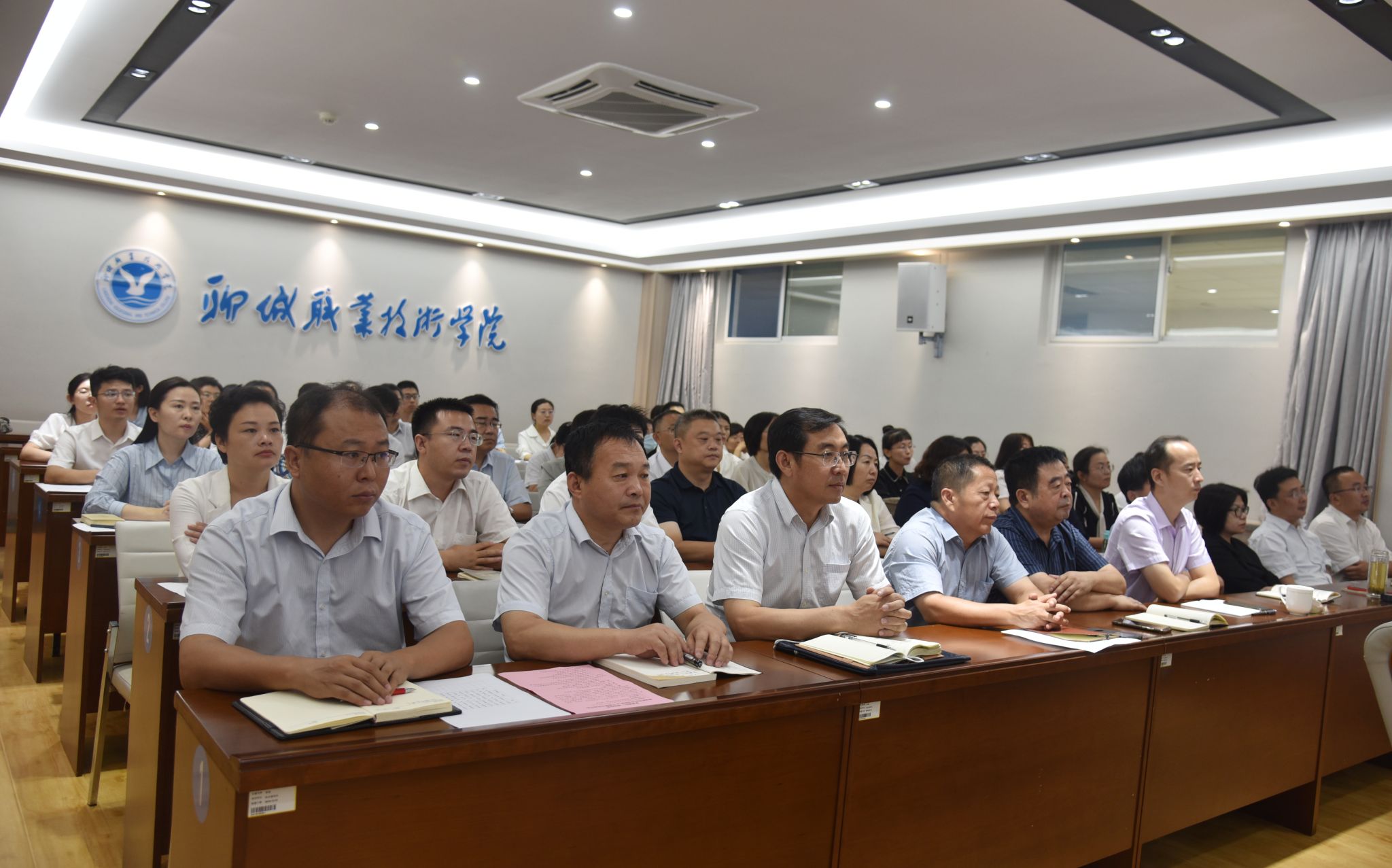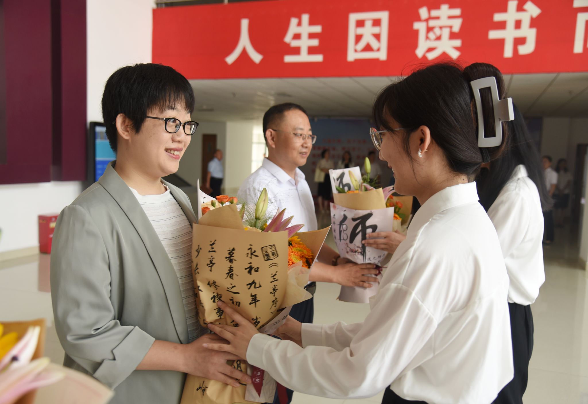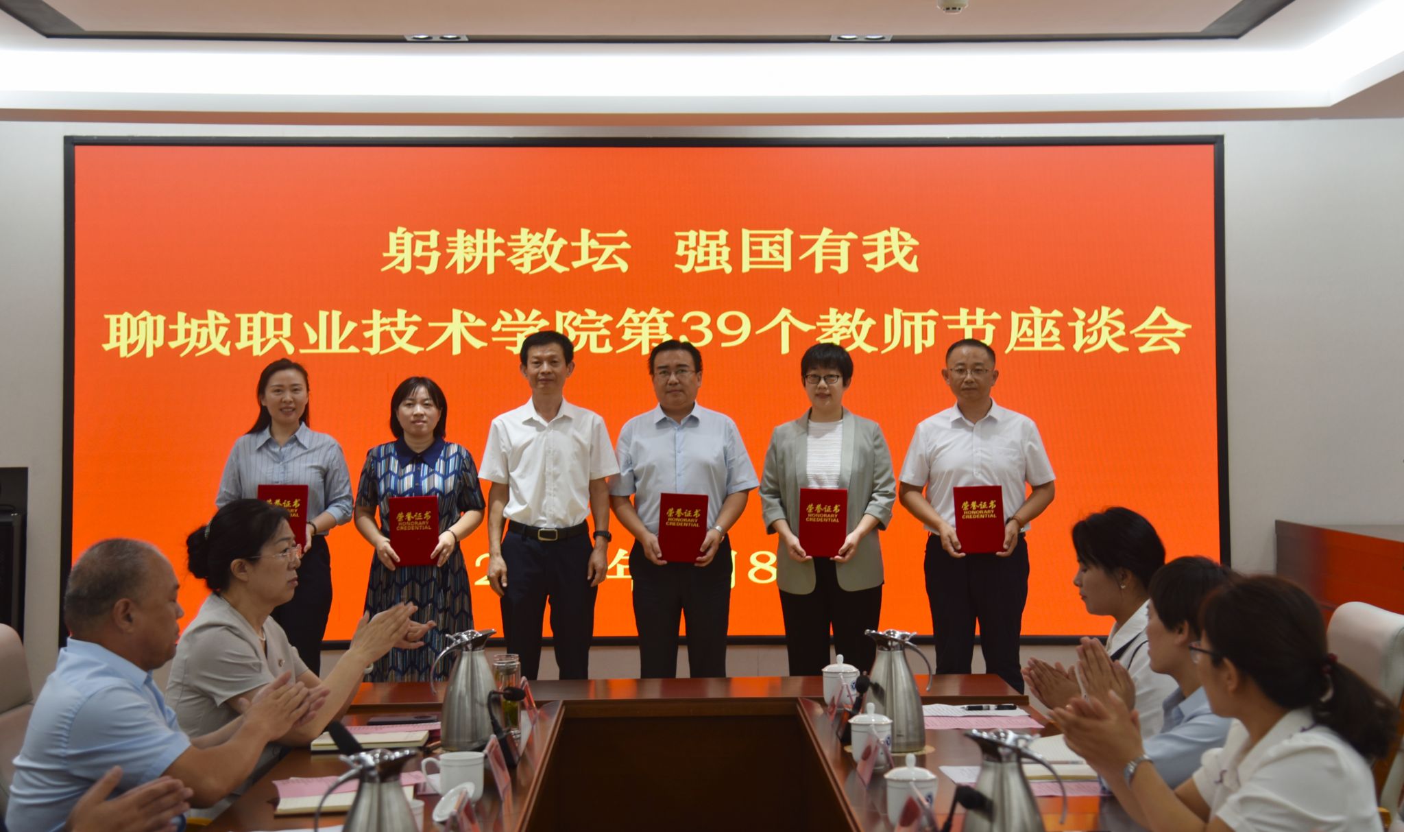座谈会前,工作人员为参会的教师代表献上鲜花,领导班子成员与教师代表合影留念。大家共同观看了《2023聊职荣耀》宣传片。