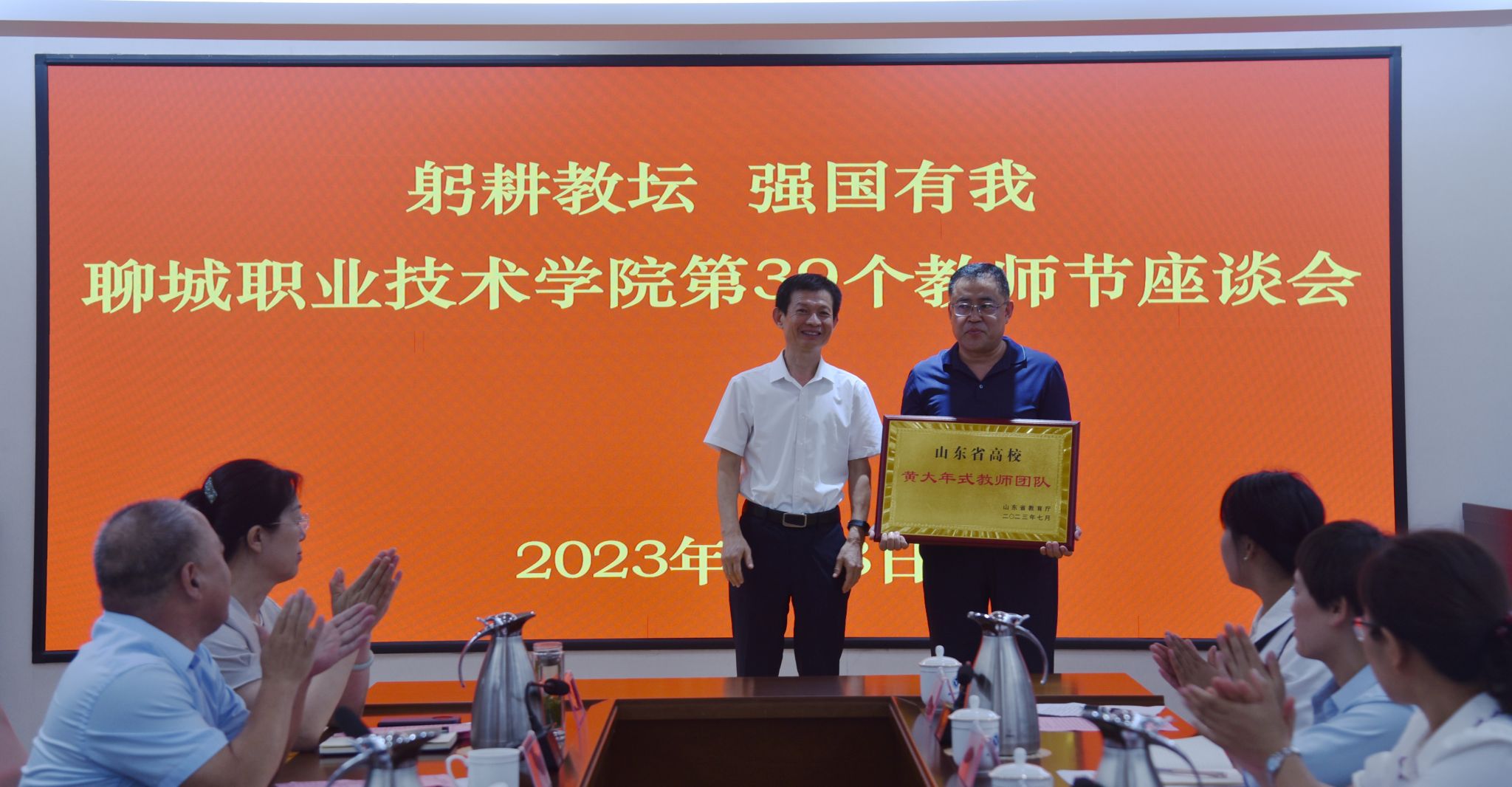 党委委员、组织部部长孙华祥宣读获得各类荣誉教师名单。徐龙海为第三批山东省高校黄大年式教师团队颁发奖牌、为校级教学名师颁发荣誉证书。