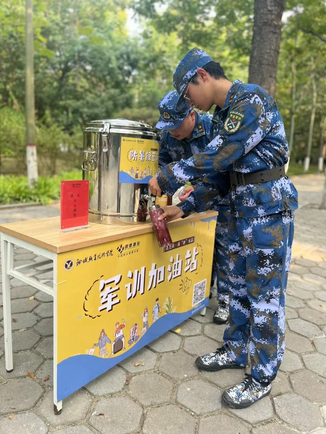 后勤服务热心:为服务军训新生,明德物业在校园设置5个地点,免费供应精心熬制“解暑神器”—爱心绿豆汤。还准备了共享花露水,拒绝蚊虫叮咬,传递关爱,为学子军训加油。