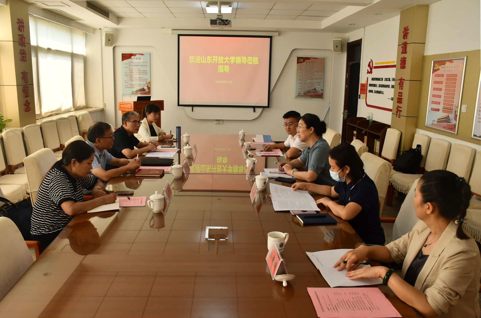 9月16日,山东开放大学党委委员、副校长谢明浩一行4人莅临聊城职业技术学院调研指导,就聊城开放大学建设进展工作和县(市、区)开放大学办学体系等进行座谈。学校党委委员、副院长刘雪巍出席并讲话,聊城市教育和体育局民继科崔永真、继续教育中心相关人员参加座谈会。
