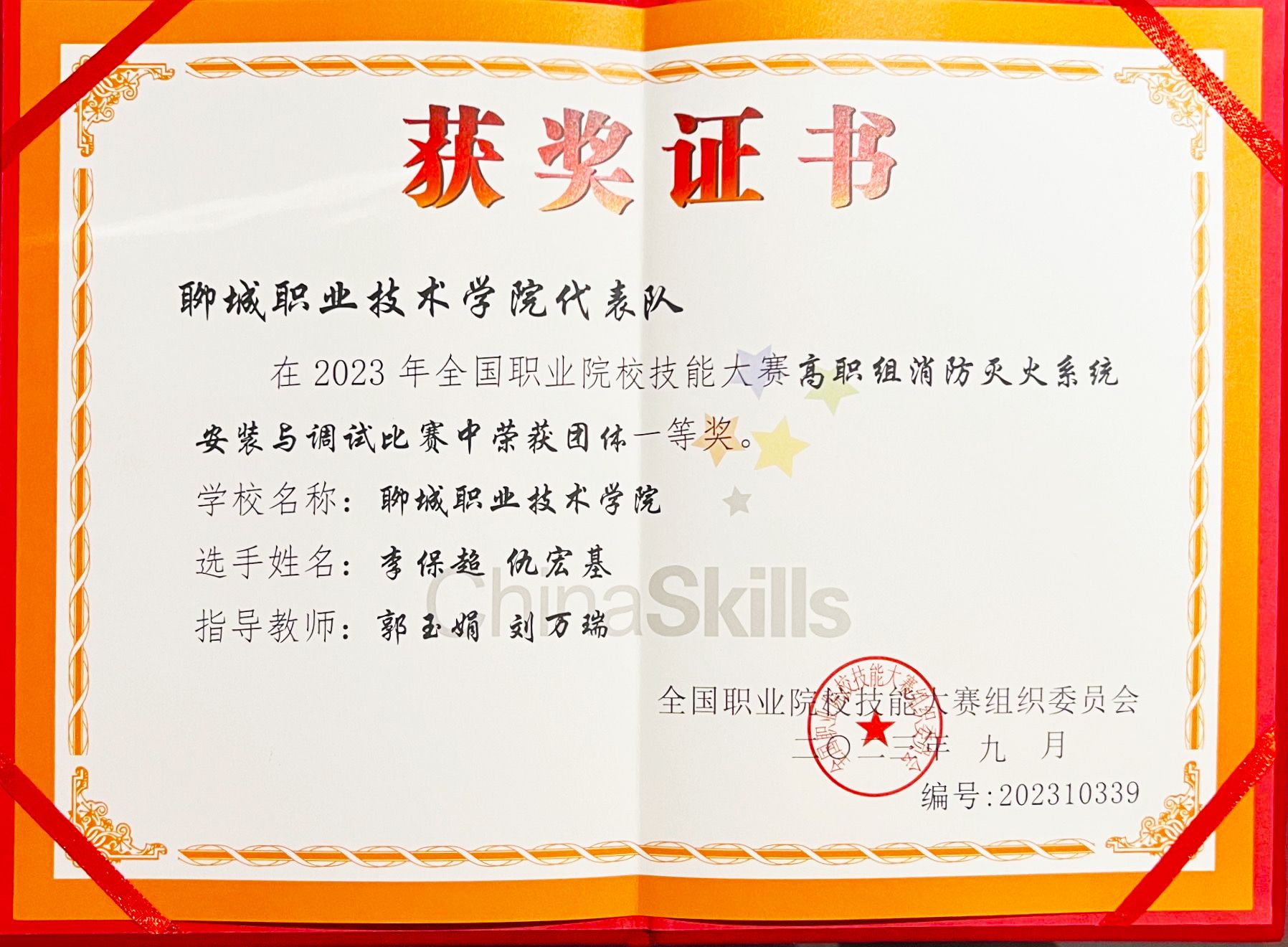 9月14至17日,2023年全国职业院校技能大赛(高职组)“消防灭火系统安装与调试”赛项在内蒙古建筑职业技术学院顺利举行。来自全国各省、自治区、直辖市的51支参赛队,102名选手参加比赛。聊城职业技术学院由应急管理学院建筑消防技术专业学生李保超、仇宏基组成的代表队以总分第二的成绩获得全国一等奖。