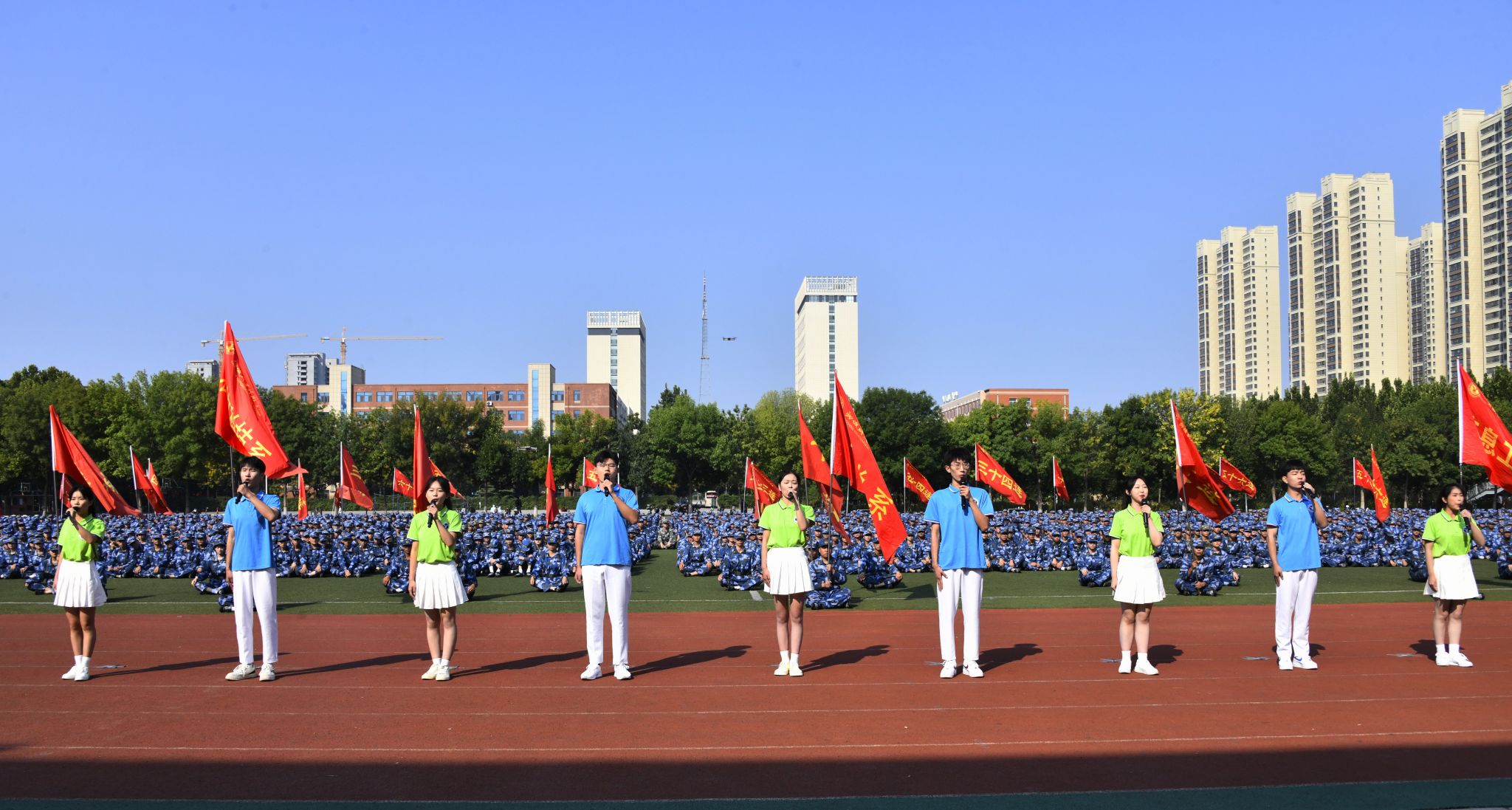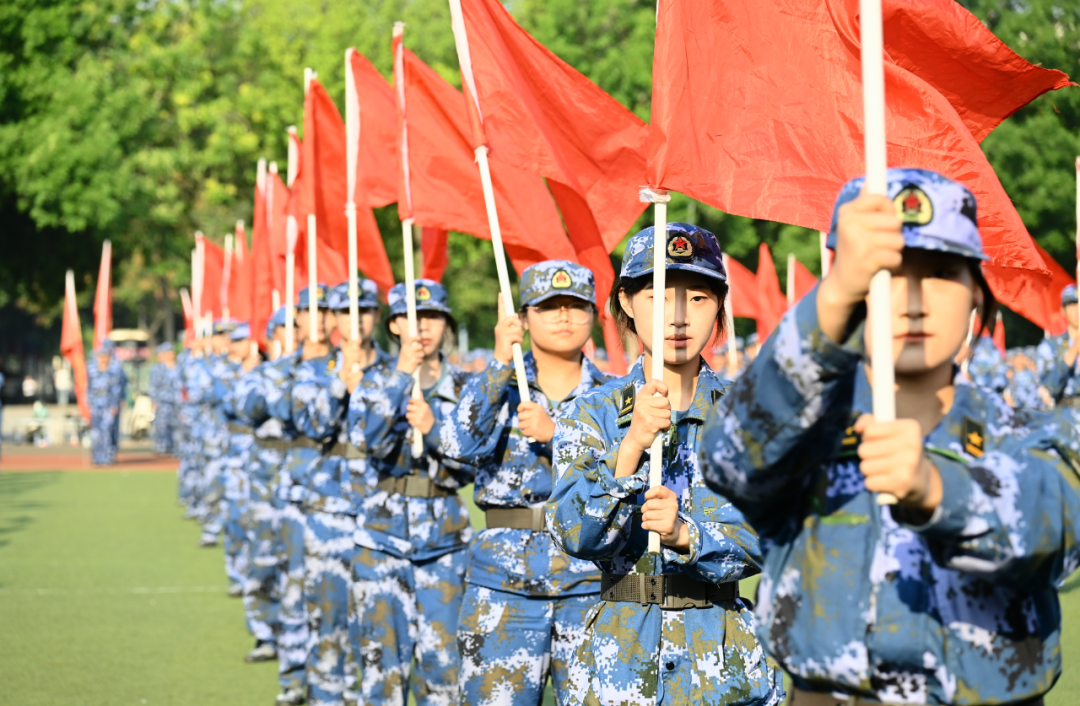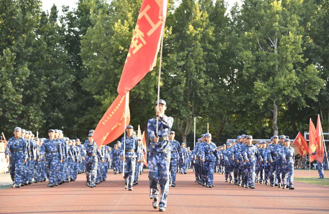 秋日的军训场上,旭日初升,红旗飘扬,学子们一身戎装整齐排列,他们精神抖擞,自信昂扬。上午8时,庄严的国歌声中,鲜艳的五星红旗冉冉升起,全体师生庄严肃立,齐唱国歌,拉开了典礼序幕。