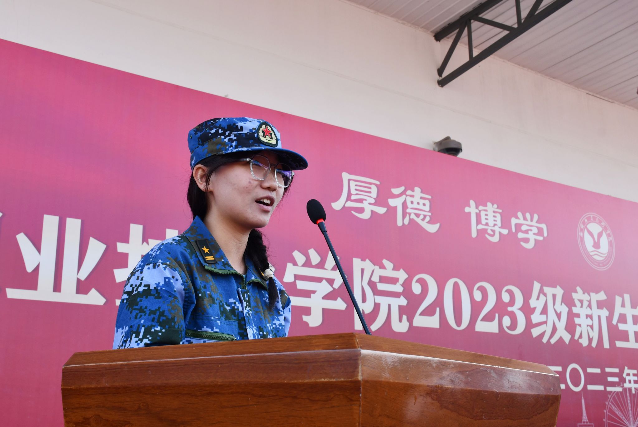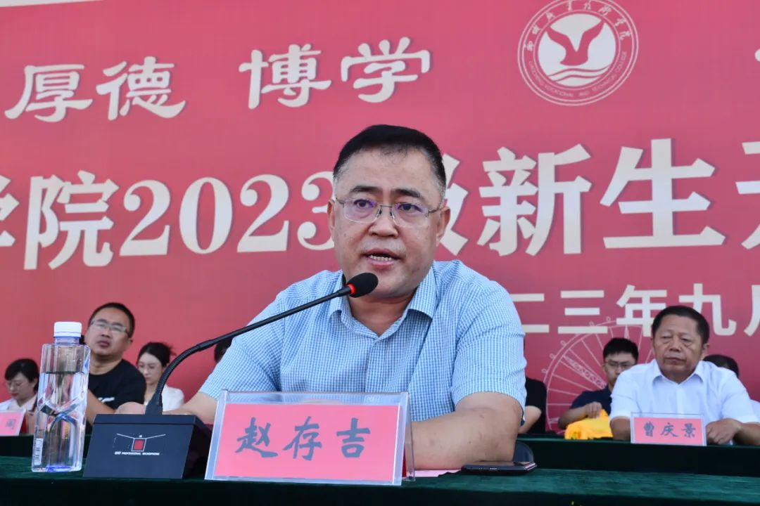 赵存吉在讲话中,代表学校向2023级新生表示热烈的欢迎和祝贺,向教官和老师们致以崇高的敬意,并对2023届新生提出了三点希望:一是学会学习,养成正确的学习习惯,掌握适合自己的学习方法,做到知行并进,学以致用;二是学会生活,要涵养良好的道德品质、要始终保持激情、要养成健康的生活方式;三是学会坚持,要坚持远大理想坚持奋斗和守正创新。他希望同学们珍惜时光,努力学习,勤于实践,用3年时光积蓄青春力量,以奋斗点亮青春,用汗水浇灌梦想,肩负起新时代的使命与担当。